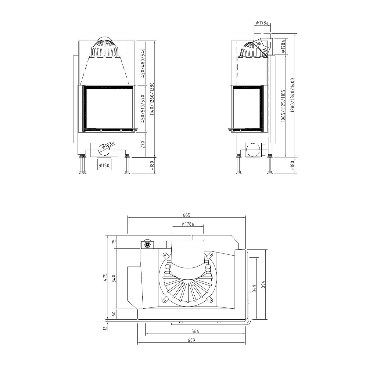 Eck-Kamineinsatz Schmid Ekko R 55(34) h mit 5 kW - Türhöhe: 57 cm - Brennraumauskleidung: Schamotte Weiß - modulares Blendrahmensystem: nein