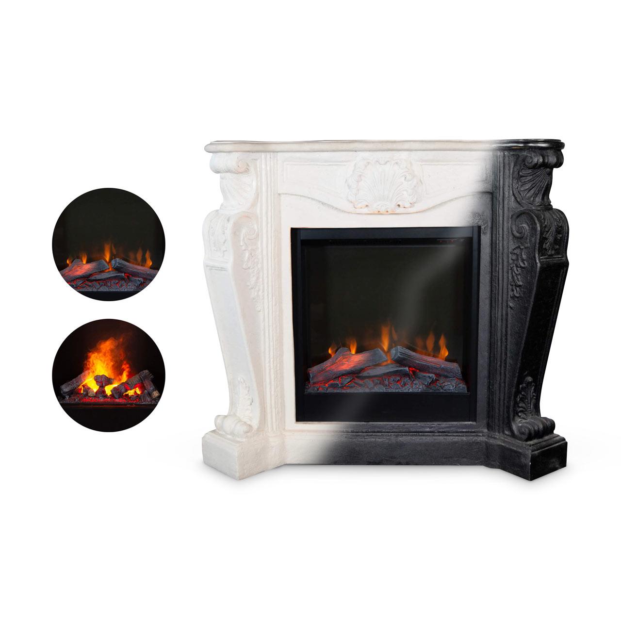Dieser Elektrokamin sticht dank seiner stilvollen Verkleidung direkt ins Auge und erinnert klassischen offenen Kamin. Die reich verzierte Verkleidung ist geprägt von Ornamenten und passt gut in klassische Wohnambiente.