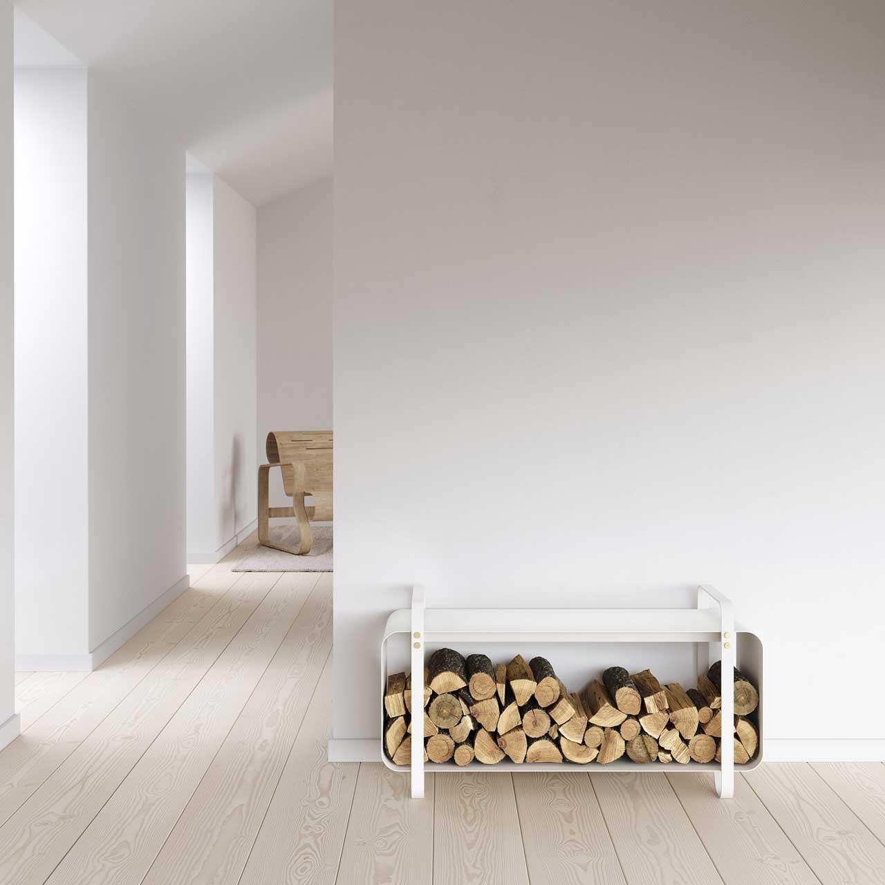 Der Eldvarm Ninne Bench - Eine schicke Alternative zur vertikalen Holzlagerung. Dies ist ein unglaublich vielseitiges Produkt, in dem Sie alles aufbewahren können, was Sie möchten, nicht nur Holzscheite, und das auch von zwei Personen als Bank verwendet werden kann. Es ist auch in einer Outdoor-Version erhältlich.