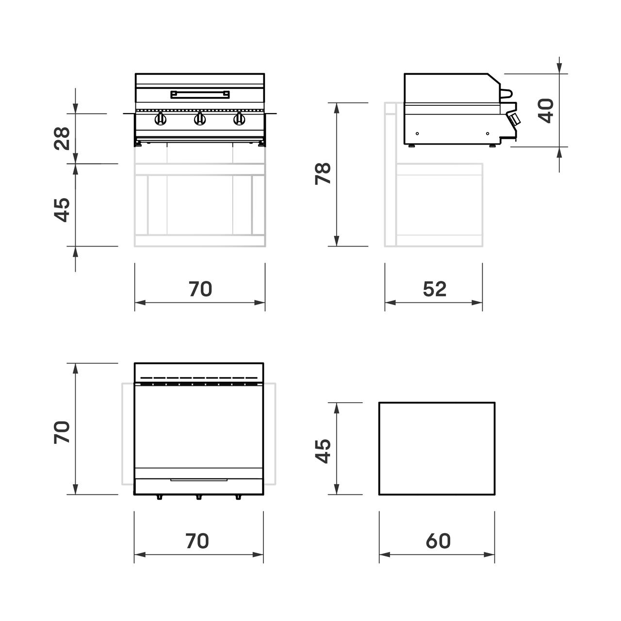 Der Einbaugrillaufsatz Gioia ist bietet mit seinen geringen Abmesusngen von 70x70xH40 cm genug Platz, um Ihre Grillgäste ausreichend zu verköstigen und ist dennoch überschaubar sowie einfach aufzustellen. Der perfekte Platz dieses Teppanyaki-Grills ist das optionale passende Unterbaumodul aus dem Hause Palazzetti.
