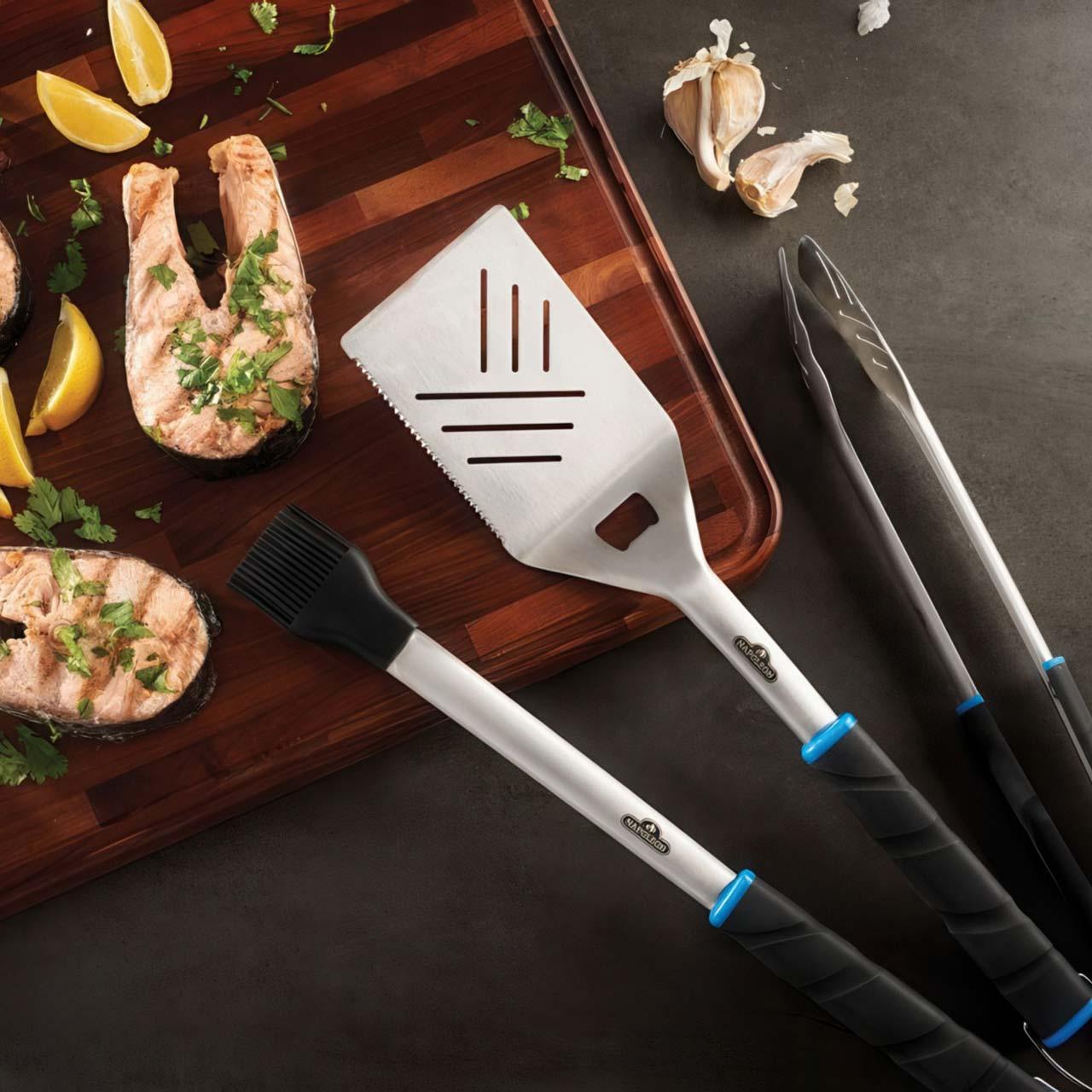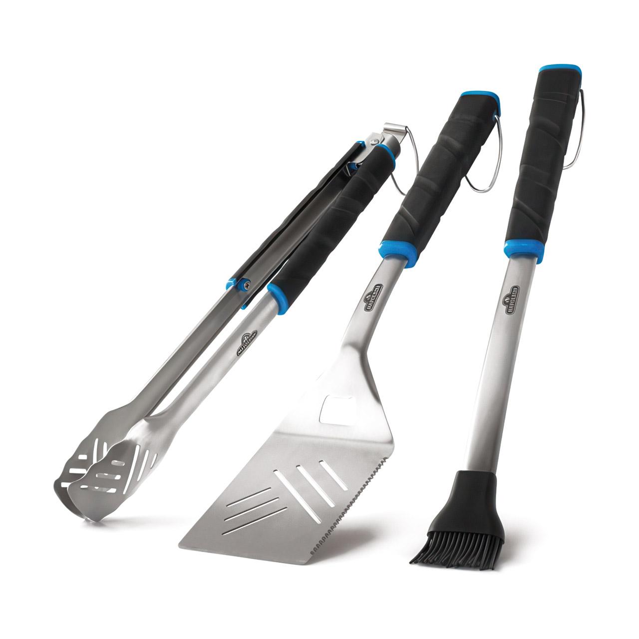 3-teiliges Grillbesteck-SetDas elegante und benutzerfreundliche 3-teilige Werkzeugset enthält alles, was Sie für Ihr nächstes Barbecue benötigen. Die Griffe liegen leicht und bequem in der Hand. Der Spatel aus des 3-teiligen Werkzeugsets verfügt über eine extra lange Fläche, eine spitze Klinge und eine gezackte Kante zum einfachen Bewegen und Wenden. Die Zange ist robust, lässt sich leicht verriegeln und entriegeln, sodass Sie immer bereit für den Grillgenuss sind. Mit der Silikon-Bastelbürste können Sie die Sauce sicher auftragen, und die Reinigung ist ein Kinderspiel, da sie spülmaschinenfest ist.