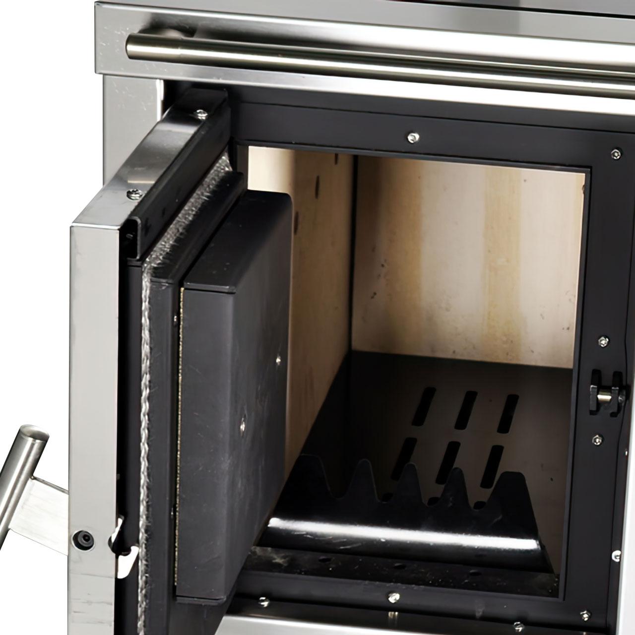 - Wärmeisolierter Edelstahlgriff an der Feuerraumtür