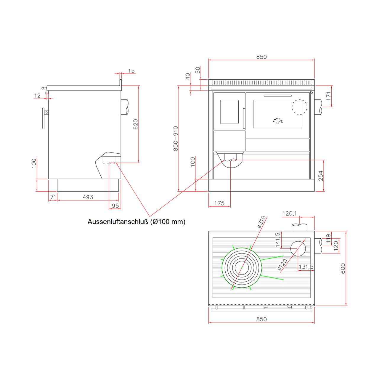 - Rauchabgang hinten, seitlich oder oben (NUR auf Stahlherdplatte), rechts oder links