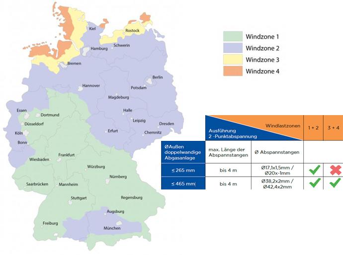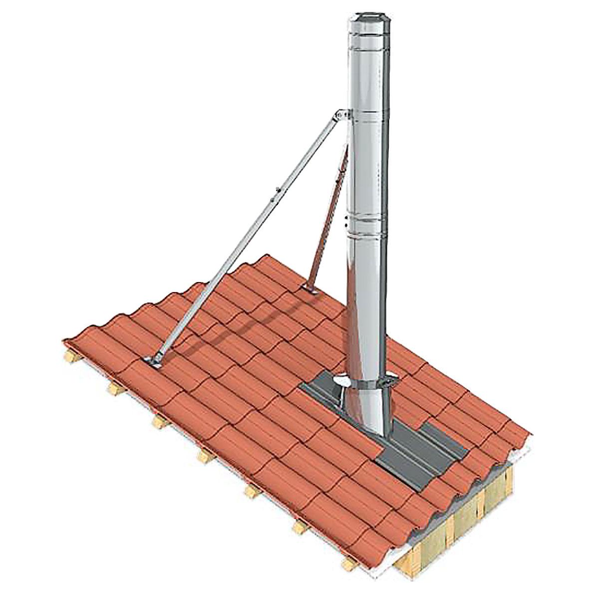 Die Zwei-Punkt-Abspannung ist eine ideale Lösung, um Ihren Jeremias DW-FU Schornstein sicher zu befestigen, wenn er über das Dach hinausragt. Die maximale freistehende Höhe über der Abspannung beträgt 2,50 Meter. Durch die einfache Befestigung der 2-Punktabspannungen lassen sich die nach 1. BimSchV §19 oder VDI 3781-4 erforderlichen Mündungshöhen mit geringen Kosten realisieren.