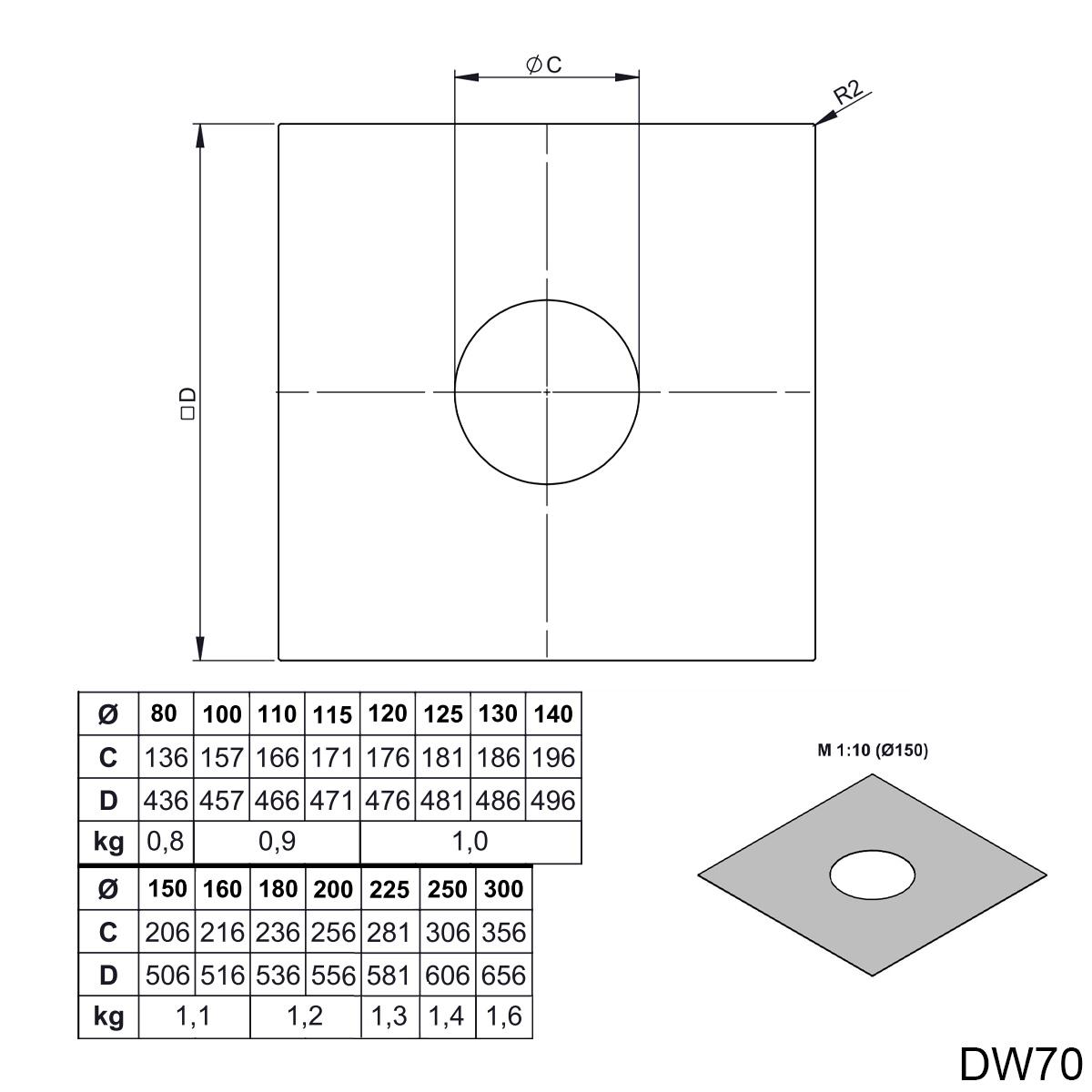 Jeremias DW-FU Wand-/Deckenblende einteilig: Diese Blende sorgt für einen ästhetisch ansprechenden Abschluss Ihrer Schornsteindurchführung. Die einteilige Variante deckt unschöne Durchbrüche an Wänden und Decken ab und ist für einen Neigungswinkel von 0° geeignet, sowie passend für Schornstein-Innendurchmesser von 80 bis 300 mm.