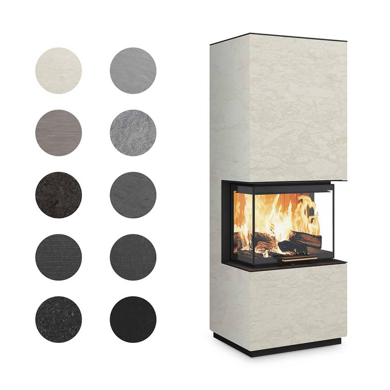 Monolith Verkleidungen - Eingerahmt wird das Feuer von einer umfassenden Verkleidung. Diese ist bei dieser Ofenanlage aus insgesamt in 10 Varianten wählbar. Jeder Naturstein ist dabei ein Unikat und einzigartig in seiner Struktur und Maserung. Die Steine werden nur in ausgewählten Steinbrüchen gewonnen und sind in Millionen von Jahren natürlich entstanden. Einige Steine besitzen besondere "livingSkin" Oberflächen, welche eine dreidimensional bewegte und lebendige Optik aufweisen.