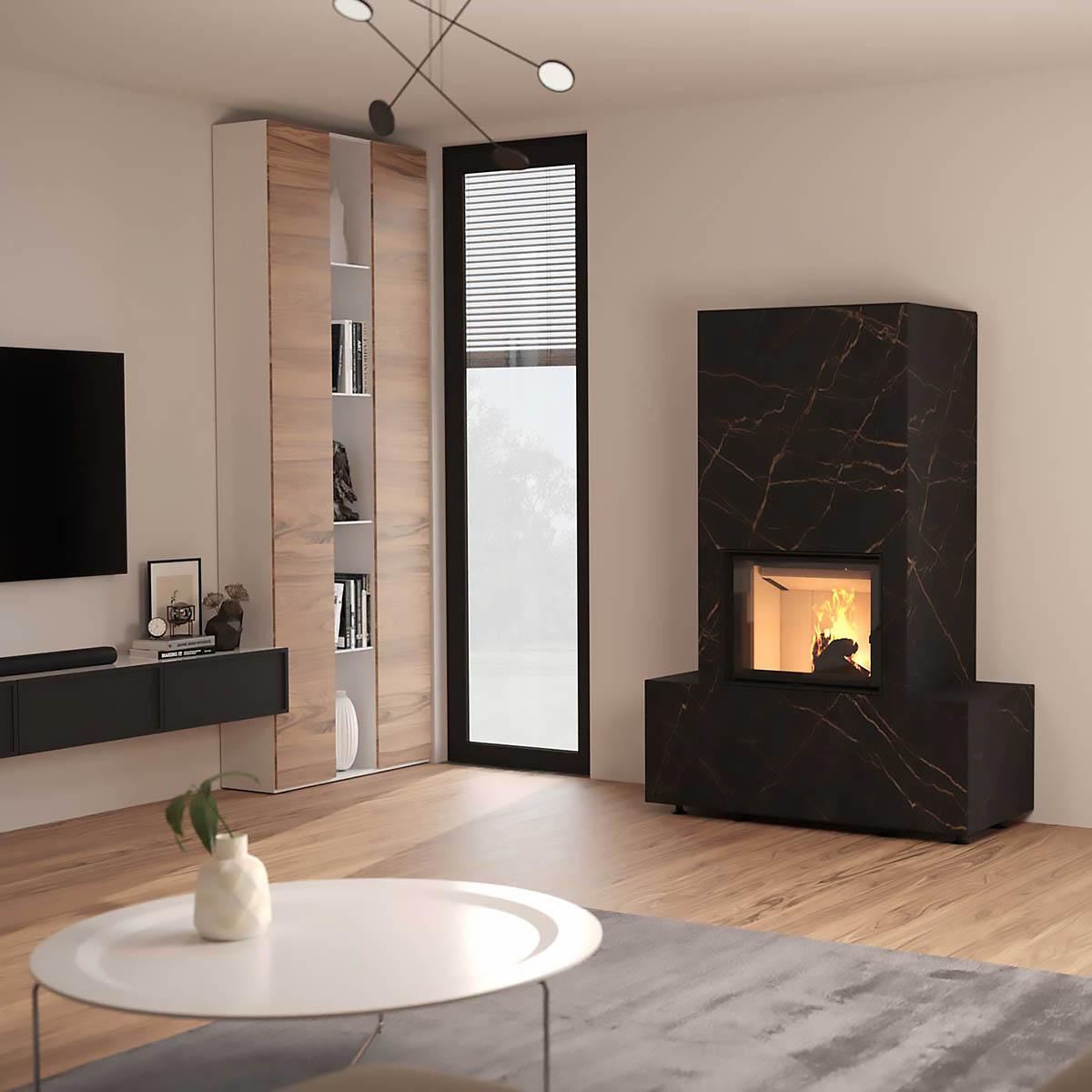 Dank seiner modularen Bauweise lässt sich der Neocube F11 leicht installieren. Die keramischen Verkleidungen werden an speziellen Befestigungspunkten ganz einfach eingehängt, ohne dass Kleben oder Verputzen erforderlich ist. Falls der Kamin an hochwärmegedämmten Wänden installiert wird, muss er um einen Strahlungsschutz ergänzt werden, wodurch sich die Tiefe des Kamins nochmals um 5 cm erhöht. Mit dem Strahlungsschutz erfüllt der Neocube F11 die Voraussetzungen der