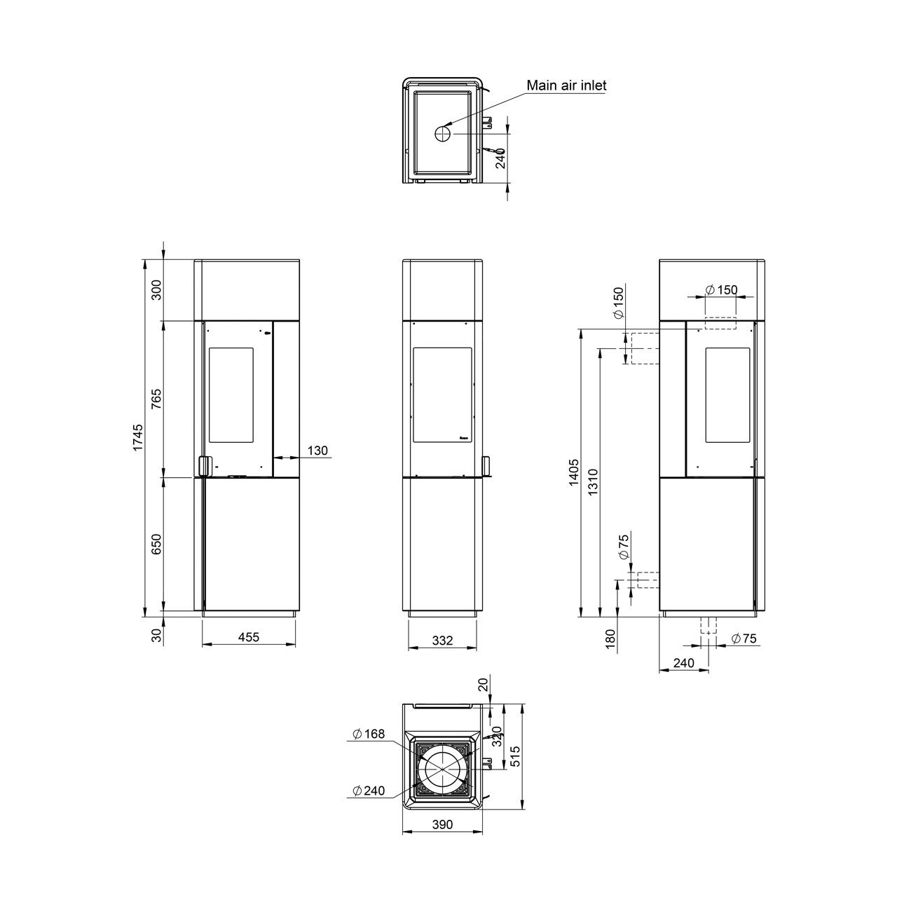 - Rauchrohranschluss: Durchmesser 150 Millimeter (oben und hinten)