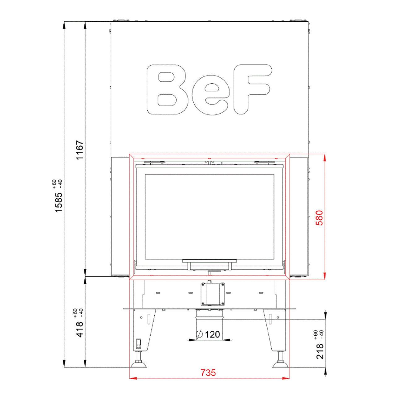 Der BeF Double V 7 N Feel ist mit einer Nennwärmeleistung von 7 kW ausgestattet. Damit kann der Kamineinsatz effektiv mittelgroße Zimmer beheizen. Der Wirkungsgrad liegt bei 82% und zeugt von einem intensiven und nachhaltigen Abbrand. Durch die sogenannte Nachverbrennung werden auch kleinste Brennstoffpartikel verbrannt und es entstehen nur wenige Schadstoffe. Außerdem heizt der Kamineinsatz sparsam und der Brennstoffverbrauch ist gering. Sie können den BeF Double V 7 N Feel dafür nutzen, um eine neue Feuerstätte zu errichten. Passen Sie die Optik Ihrer Kaminanlage einfach an Ihre Wünsche an, etwa mit einem zur Auswahl stehenden Einbaurahmen oder verstellbaren Füßen.