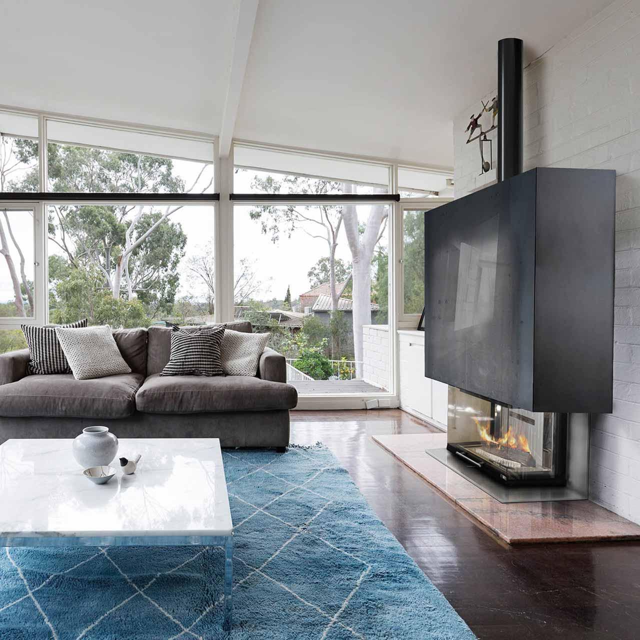 BeF Royal V 8 C: Kamineinsatz mit dreiseitiger Flammensicht und hochschiebbarer Feuerraumtür