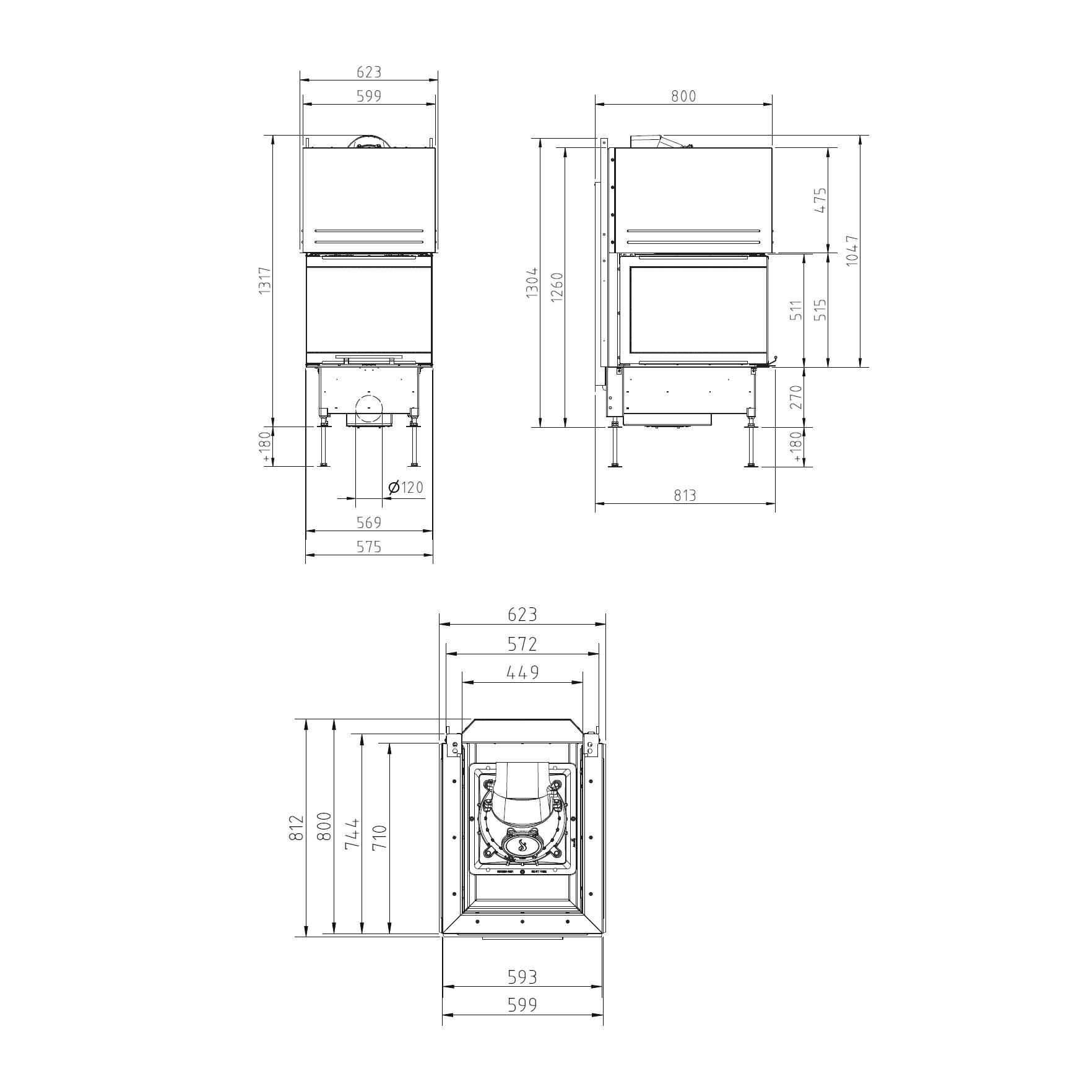 außerhalb des Strahlungsbereiches: 5 cm (Abstand zu brennbaren Bauteilen/Baustoffen an freier Außenfläche der Kamineinsatz-Verkleidung)