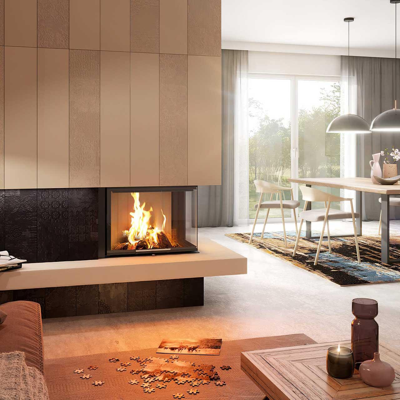 - L-Form Kamin mit Ecksichtscheibe rechts