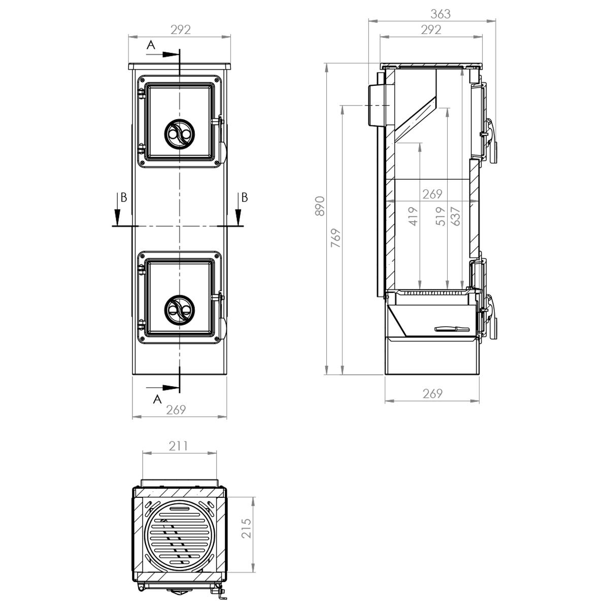 | Maße Feuerraum (H / B / T) | 211 / 215 / 630 mm |