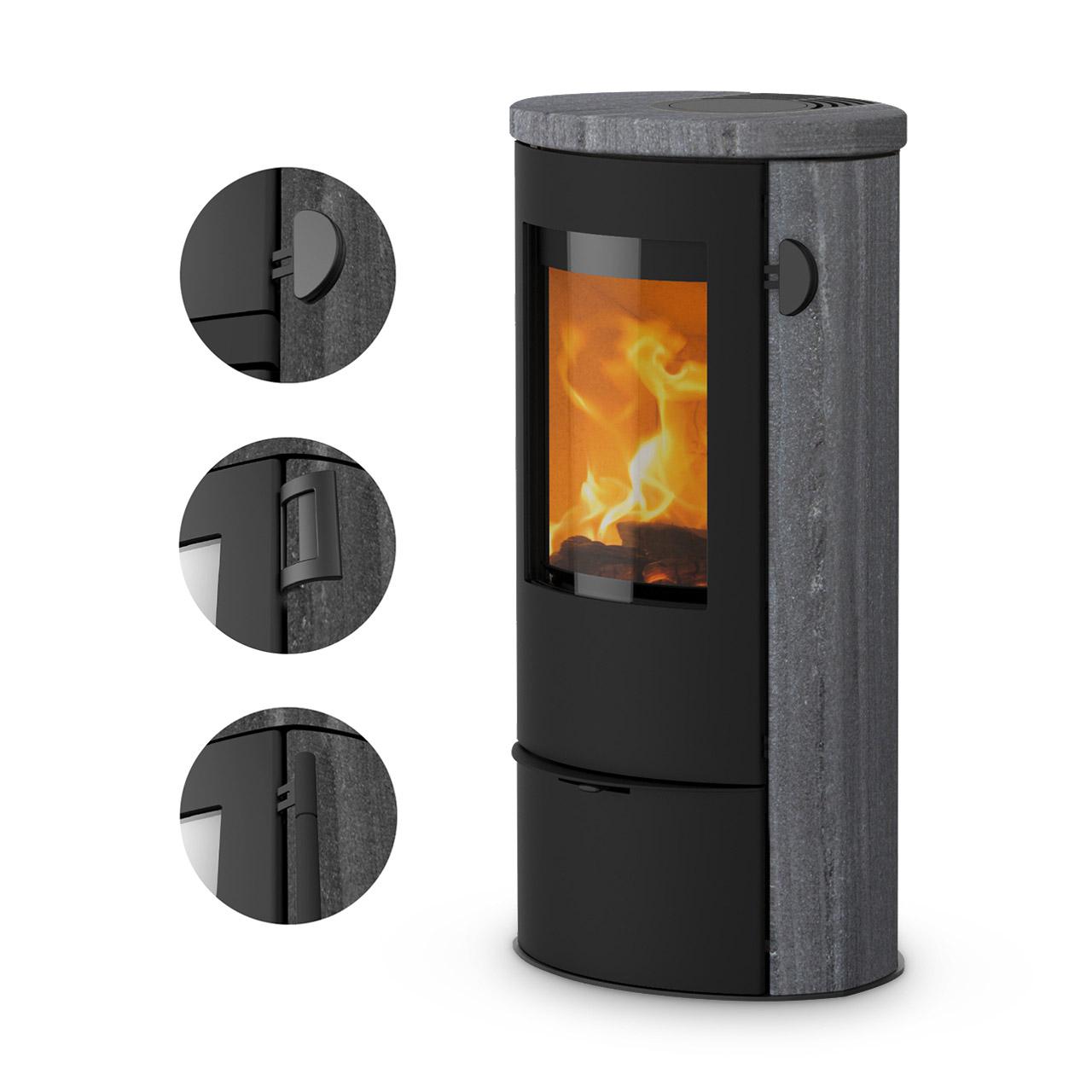 - Sichtglas mit Scheibenspülung: hält die Glasflächen weitgehend sauber, sodass Sie immer einen klaren Blick auf die Flammen haben.
