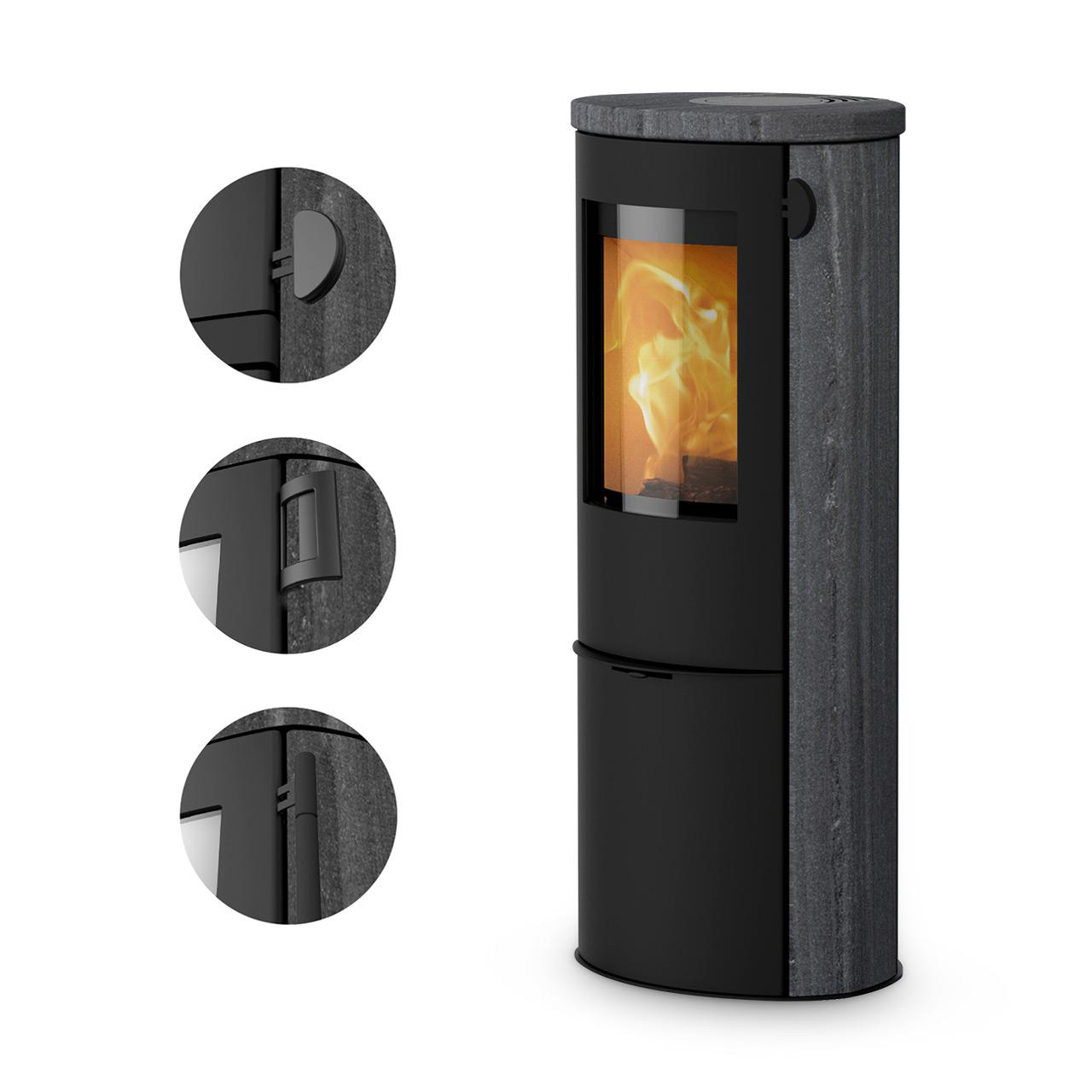Mit einer Nennwärmeleistung von 5 kW kann dieser Ofen Räume bis zu 120 m² effizient Heizen. Die verschiedenen Griffvarianten ermöglichen es Ihnen, den Holzofen ganz nach Ihrem persönlichen Geschmack zu gestalten.- Griff Classic: Ein eleganter Stangengriff aus schwarz lackiertem Stahl, der vertikal an der Ofentür verläuft.