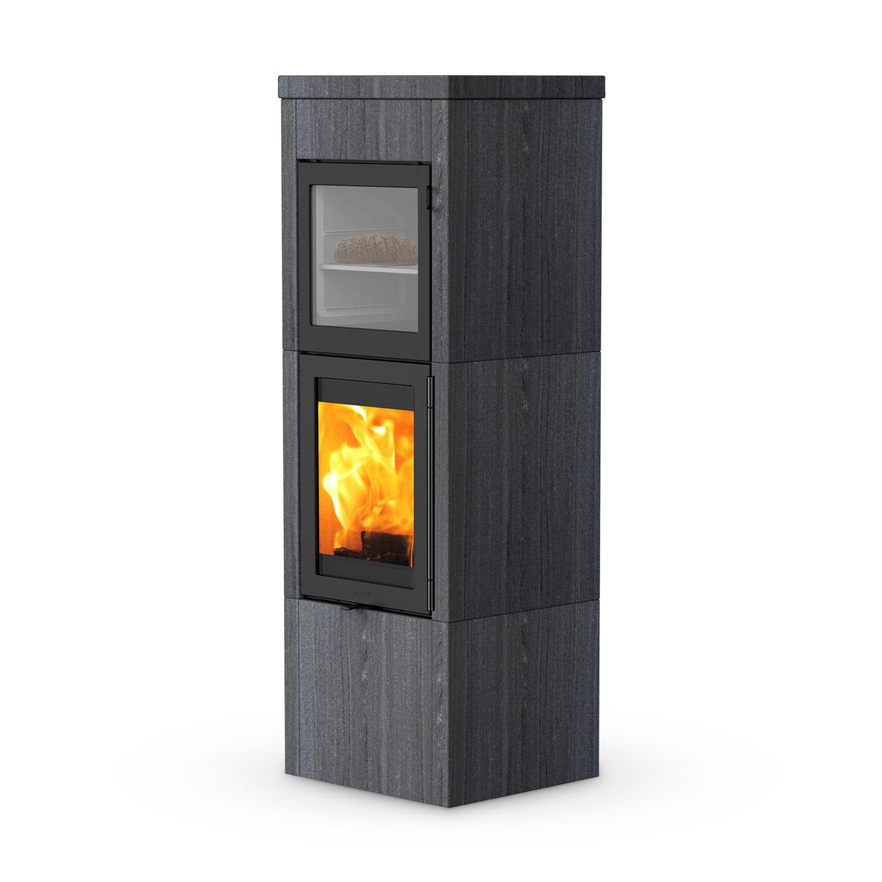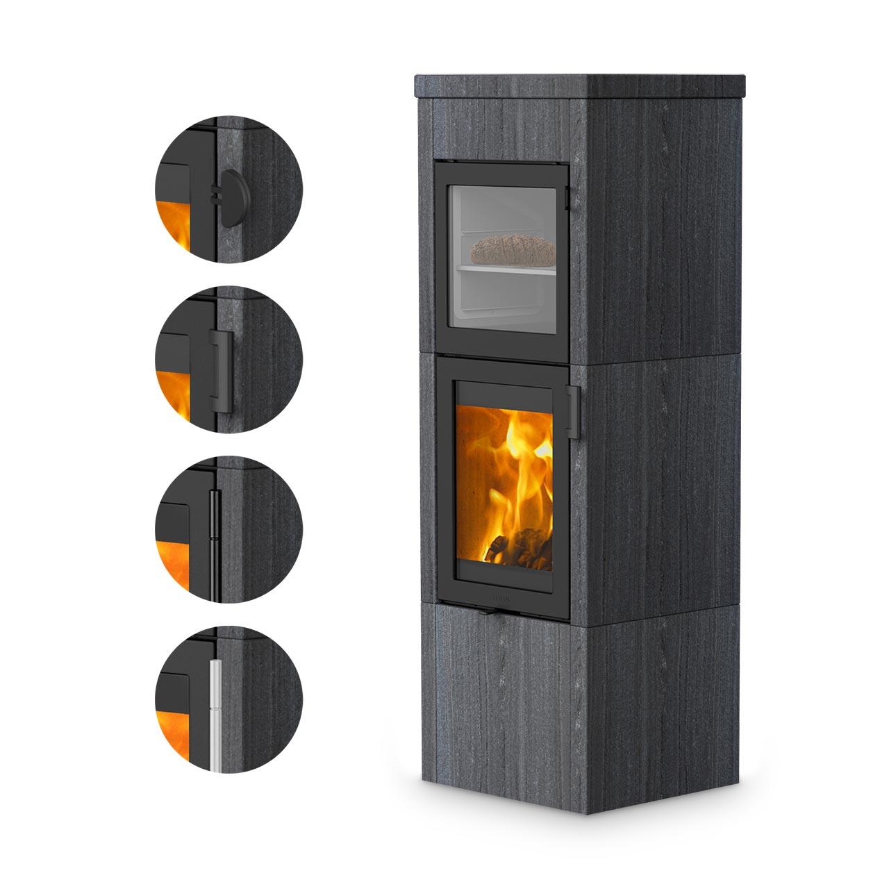 - Warmhaltefach und Brennkammer mit gusseiserner Tür, lieferbar in schwarz oder grau