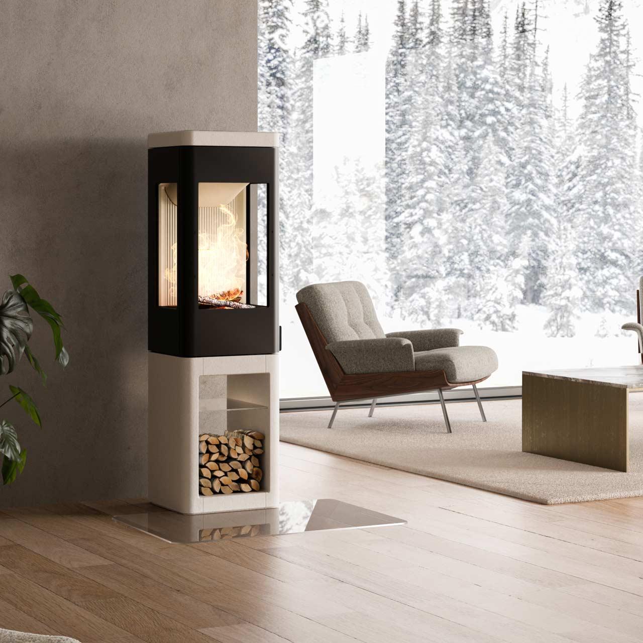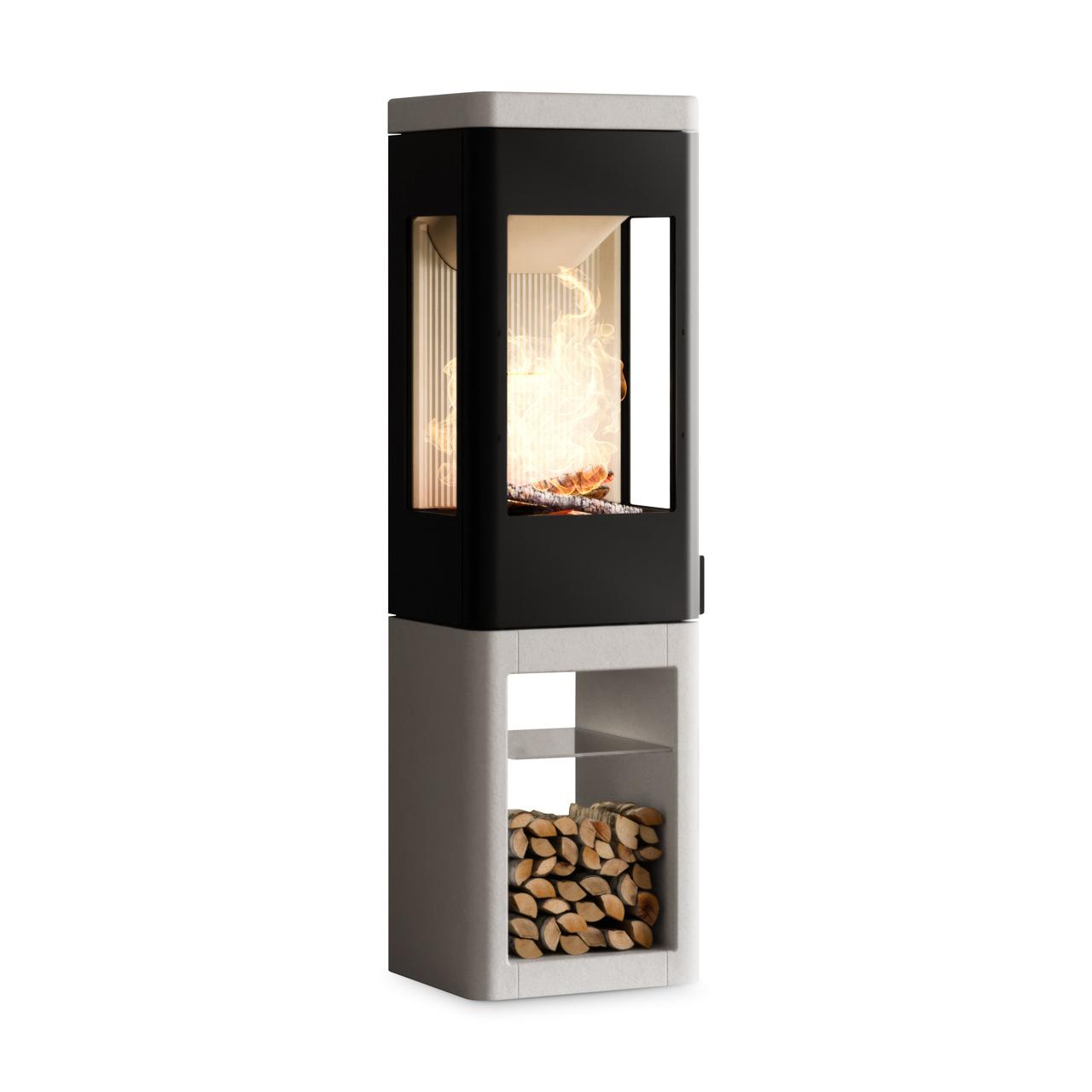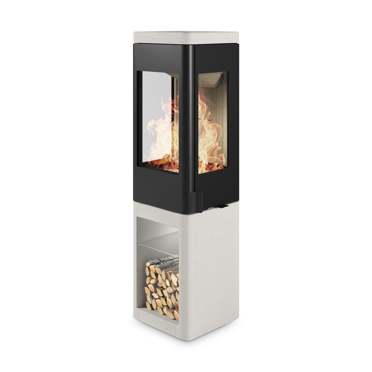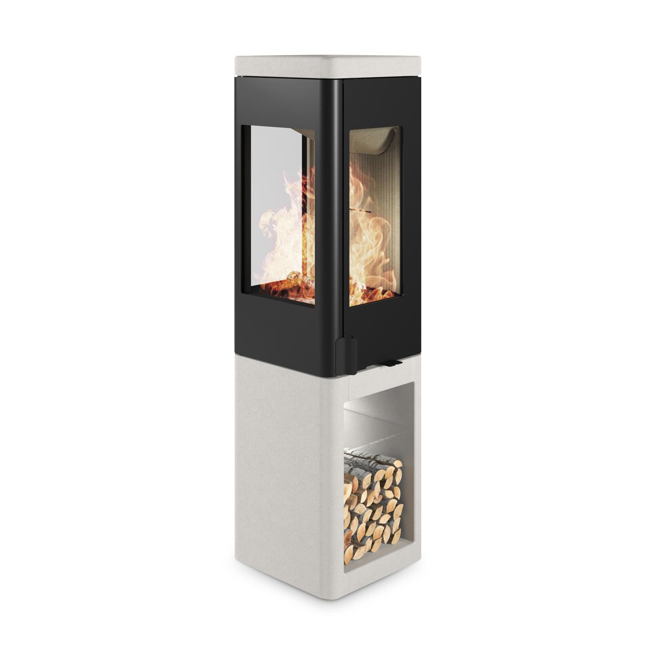 Der Kaminofen einer in schwarz gestalteten Brennkammer und einem Sockel aus weißem Colorado-Beton, einem speziell entwickelten Material mit wärmespeichernden Eigenschaften und einer polierten Oberfläche. Außerdem verfügt der Sockel über ein Holzlagerfach, das wahlweise von vorn oder der Seite aus zugänglich ist. Dieser Nordpeis Ofen bietet eine beeindruckende Sicht auf die lodernden Flammen durch insgesamt 3 Sichtfenseter.Clevere Lösungen für maximalen Komfort