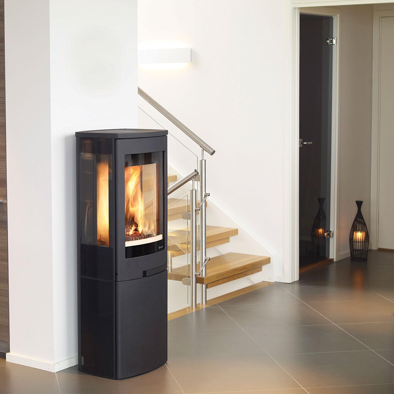 Die Form des Kaminofens von Nordpeis ist leicht geschwungen, was ihm einen eleganten Auftritt verleiht und dank seiner geringen Tiefe von nur 36,5 cm findet er auch in Korridoren oder anderen beengten Wohnverhältnissen seinen angestammten Platz. Trotz seiner kompakten Maße besitzt er eine großzügige 3-seitige Verglasung: Lassen Sie sich in den Bann des bezaubernden Flammenspiels in seinem Herzen ziehen.