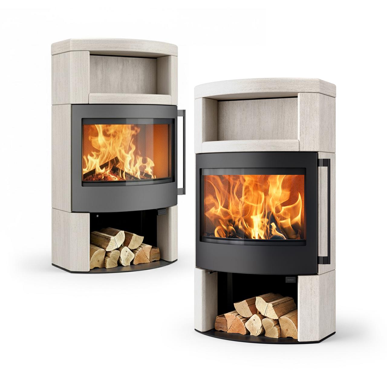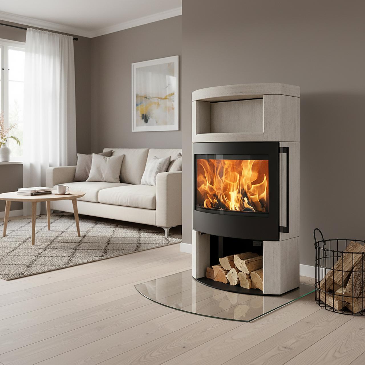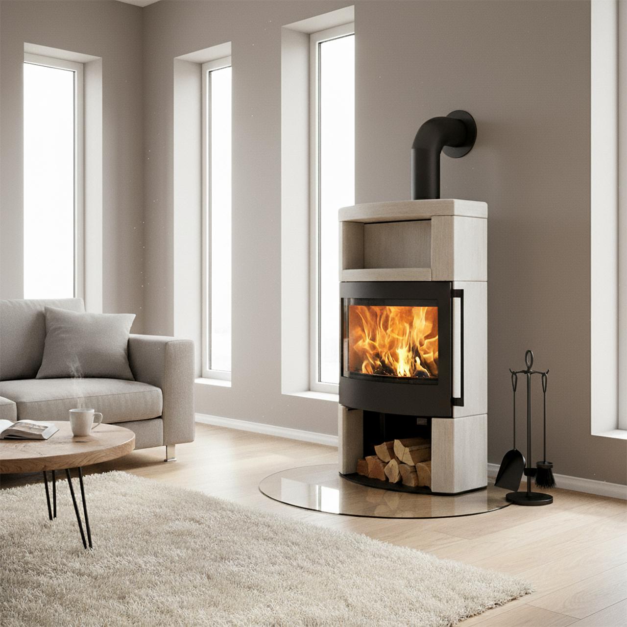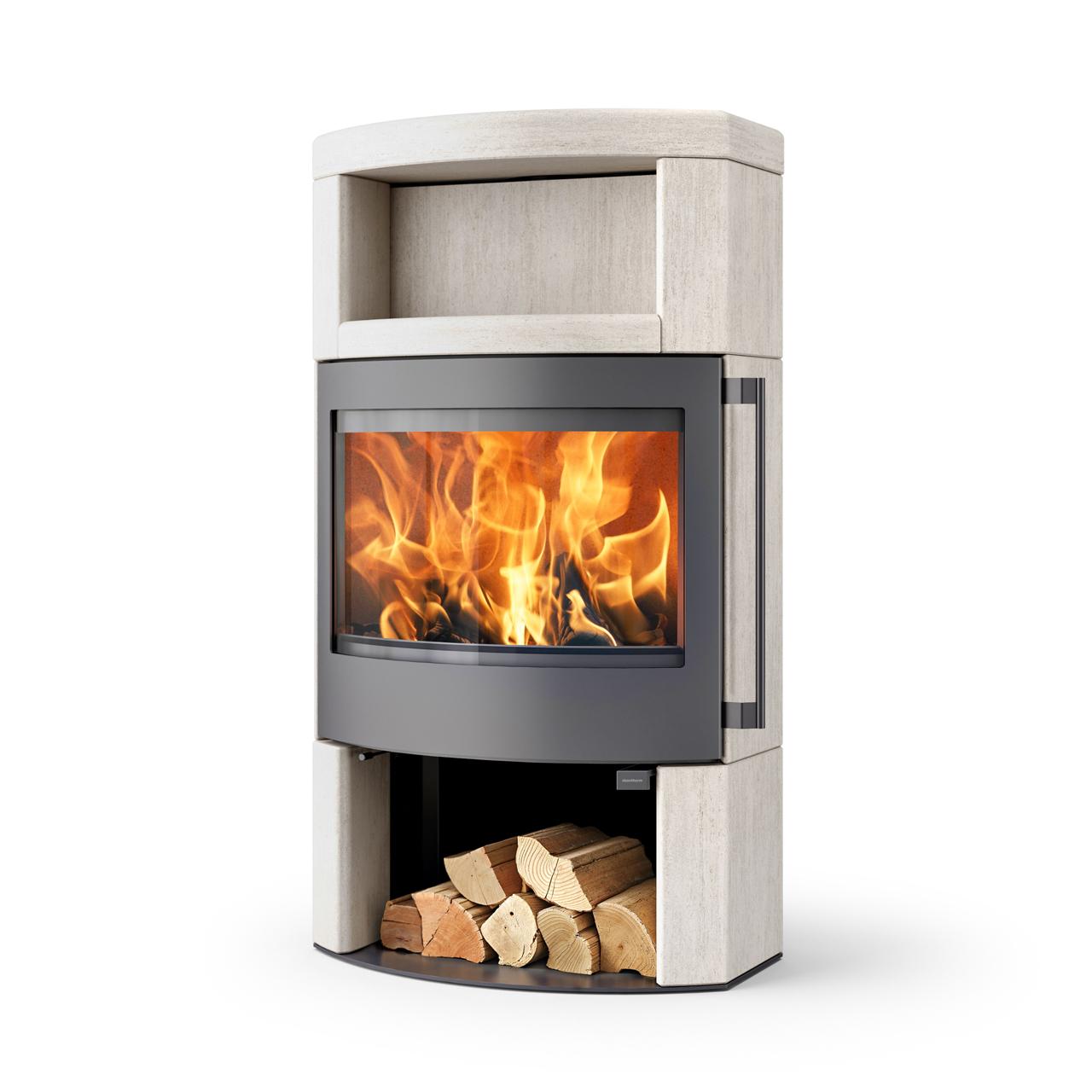Skantherm Ator Plus 2.0 Naturstein Creme kombiniert Speicherwärme mit großzügigem Feuerblick