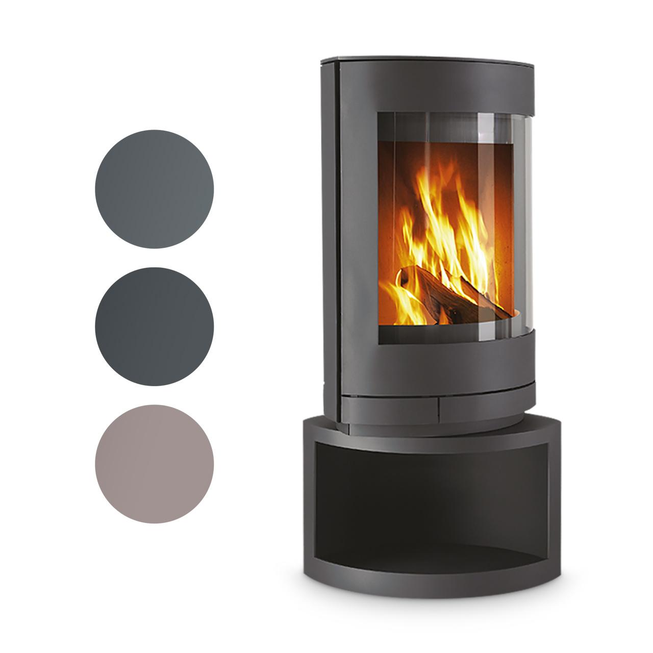 Bei diesem Kaminofen handelt es sich um eine moderne Feuerstätte mit einer ovalen Form und spitz zulaufenden Ecken. Der Korpus vom Kaminofen Skantherm Emotion S besteht standardmäßig aus robustem Stahl, der hitzebeständig in der Farbe Grau, auf Wunsch auch in schwarz oder dem Farbton Platin beschichtet ist. Die Front ist dabei mit einer großzügigen gewölbten Panoramasichtscheibe ausgestattet. Auch während des Betriebs des Kaminofen Skantherm Emotion S drehbar bleibt der Türgriff, der in die Front integriert ist, angenehm kühl und kann jederzeit betätigt werden.