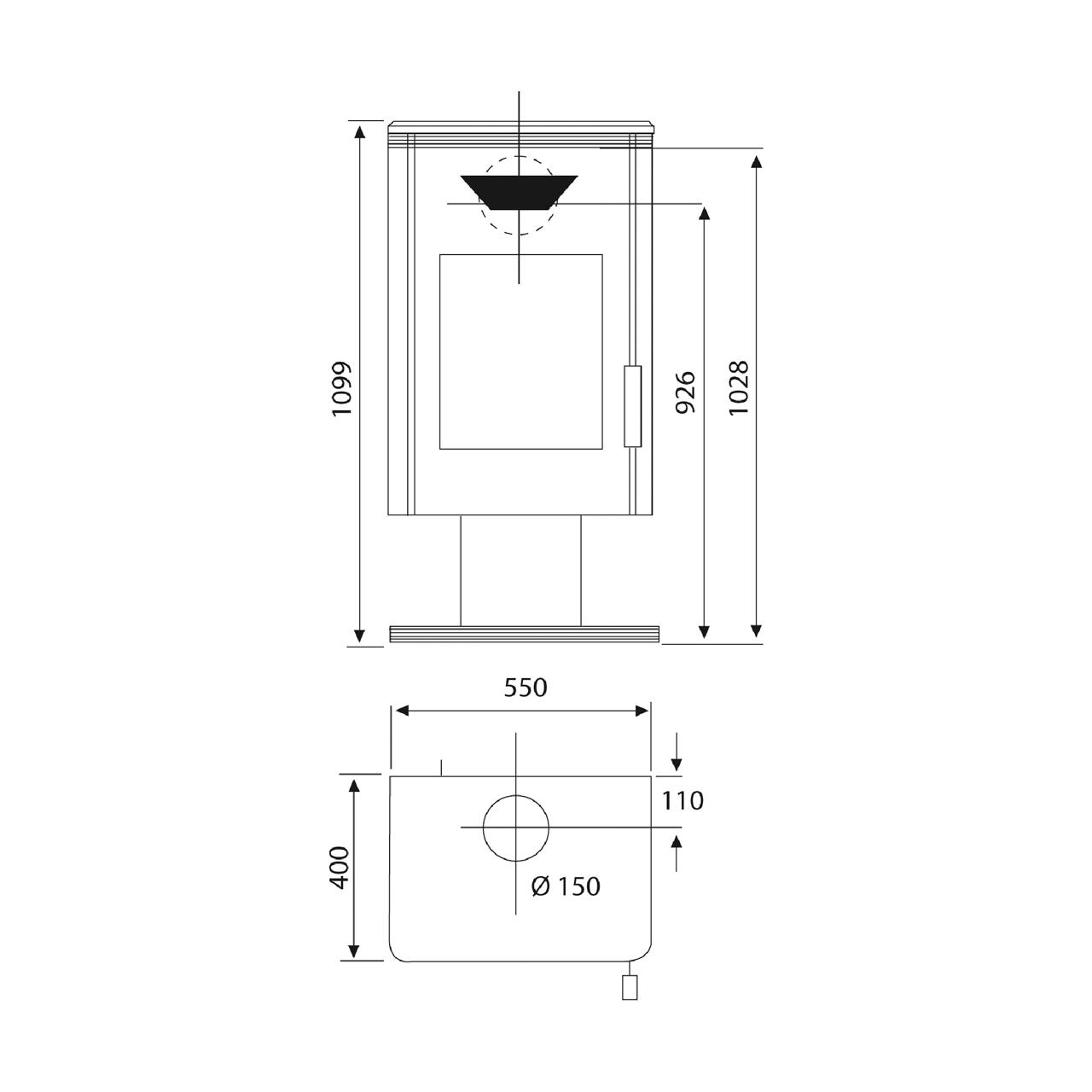 - Anschluss: Flexibler Abgasanschluss oben oder hinten (Ø 150 mm)