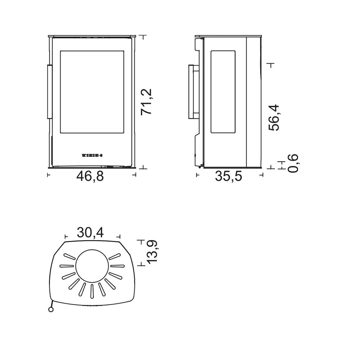 | Mindestabstände zu brennbaren Materialien | Rückwand 10 cm Seitenwand 52 cm Strahlungsbereich Scheibe 90 cm Bei Eckplatzierung, 45° - von der Verkleidung 7 cm Bei Eckplatzierung, 45° - ausgehend von der Mitte der Rauchabzugsöffnung, oben 57,9 cm |