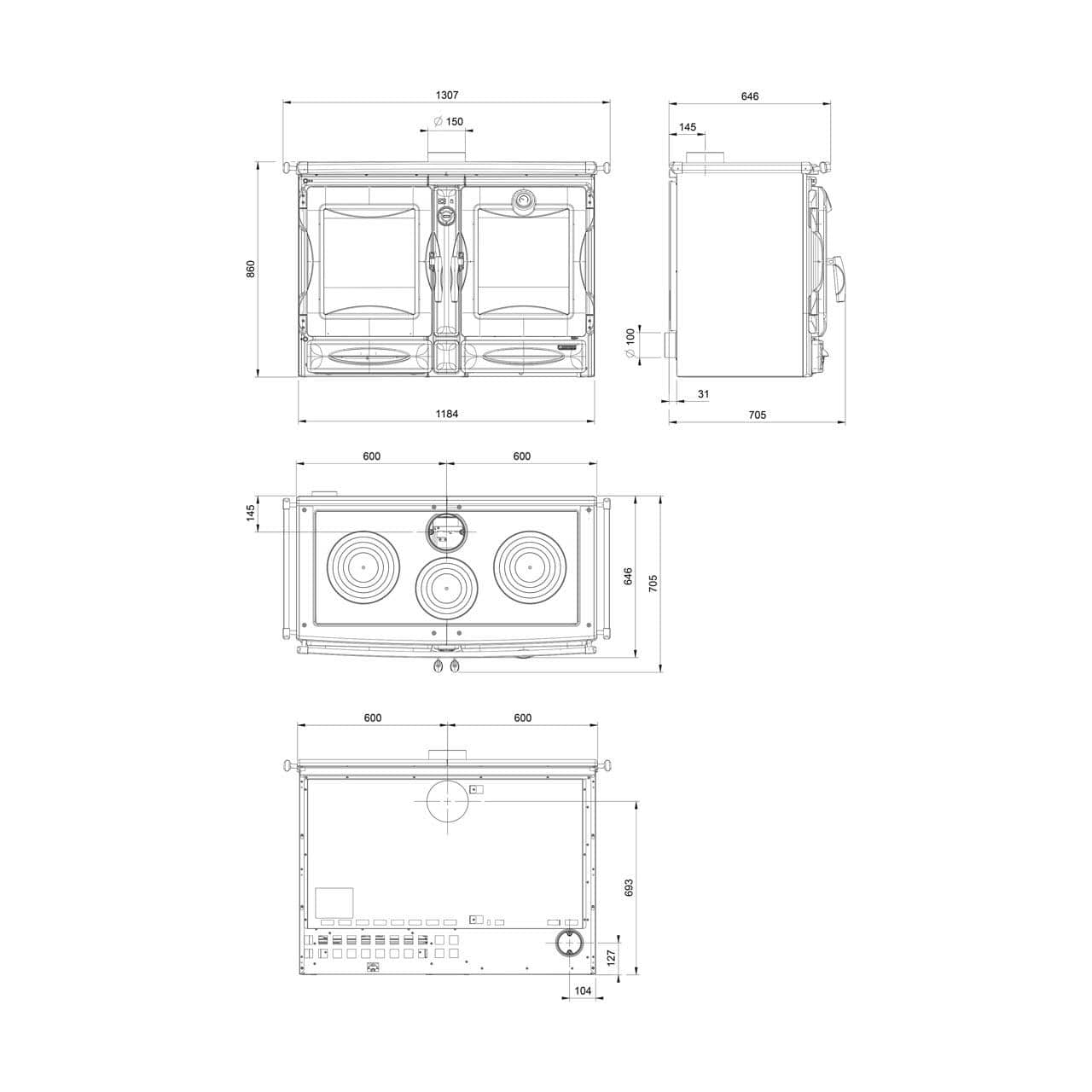 - Anschlussmöglichkeiten: Rauchrohr Ø 150 mm, Anschluss hinten oder oben; externe Verbrennungsluftzufuhr möglich (Zuluft Ø 100 mm)