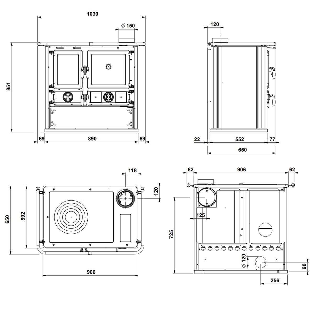 La Nordica setzt auf langlebige Materialien und eine solide Konstruktion. Rahmen, Feuerraum und Herdplatte bestehen aus massivem Gusseisen. Ein Aschekasten erleichtert die Reinigung. Die separate Luftzufuhr von außen (optional) verbessert den Abbrand und sorgt für frische Raumluft. Gerade in gut gedämmten Häusern ist das ein echter Vorteil.