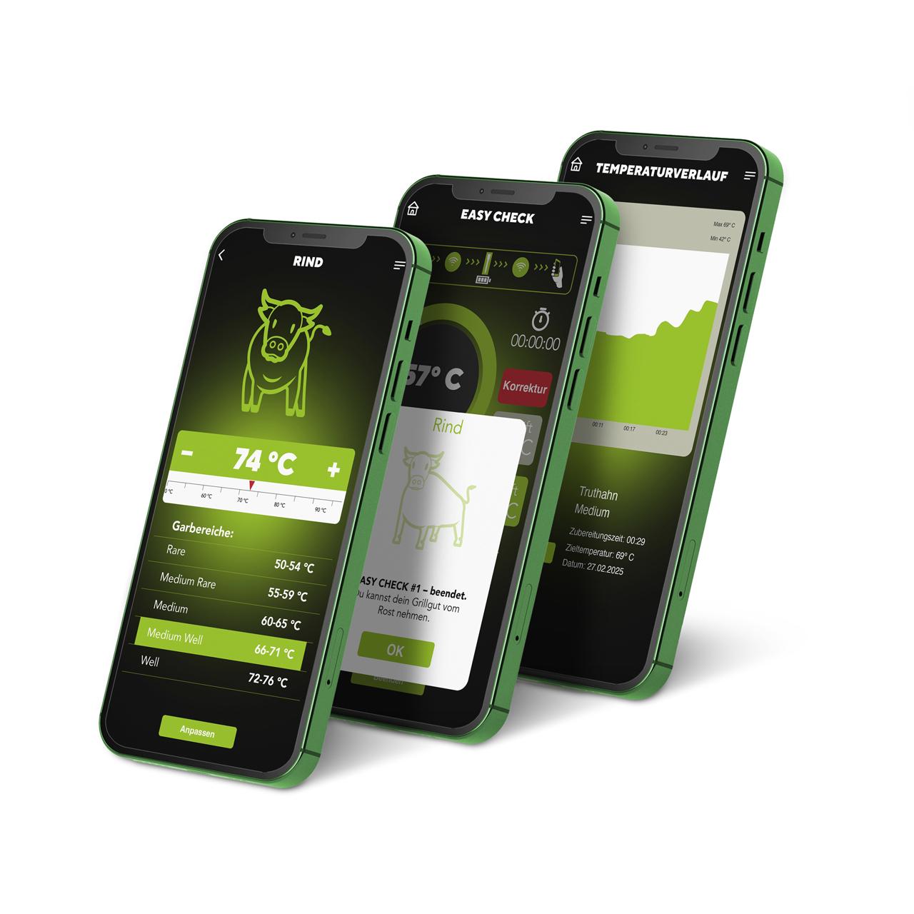- Smartphone-App mit Kerntemperatur-Bibliothek, Timer- und Alarmfunktionen