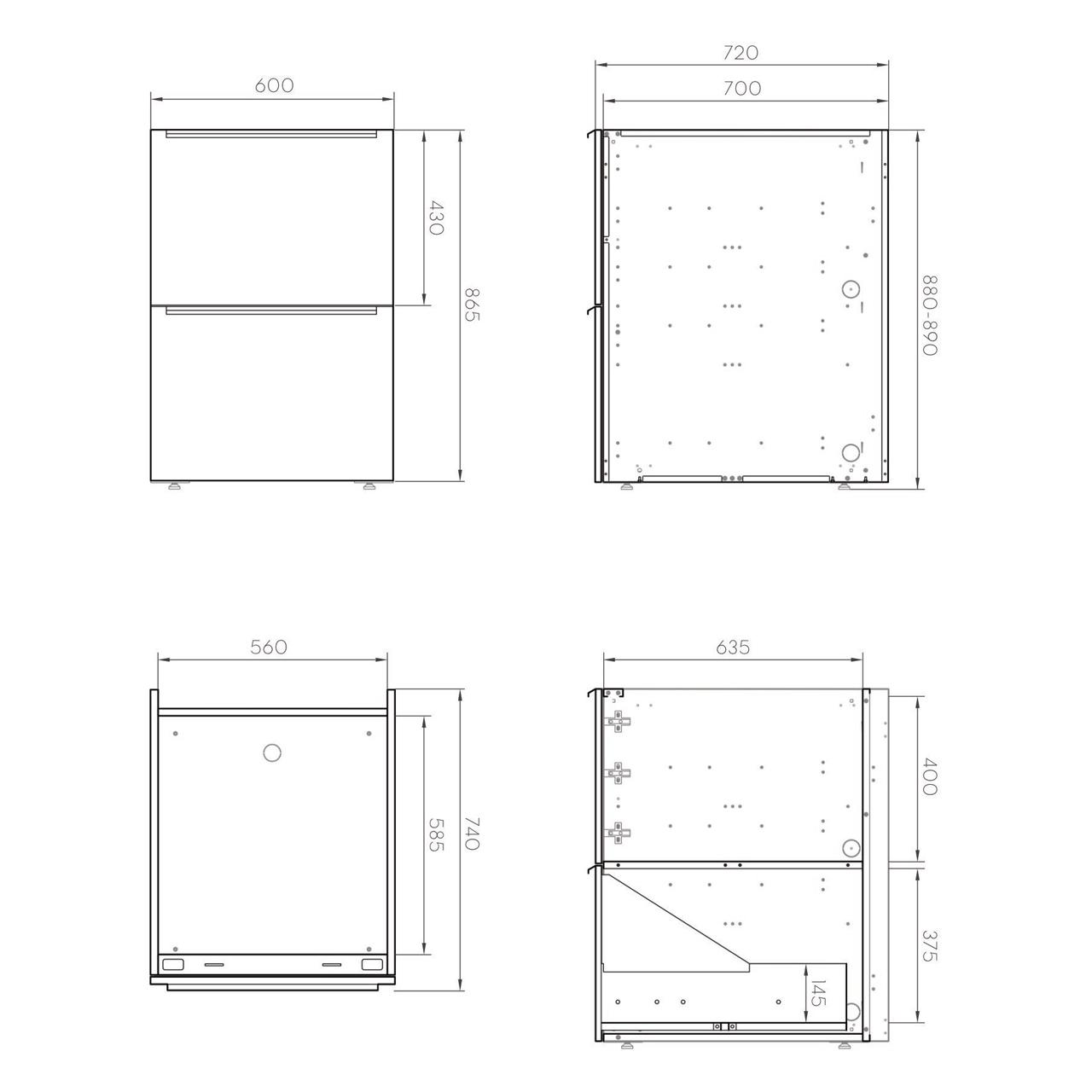 - Vier Ausführungen: Tür oder Schublade oben und unten frei kombinierbar