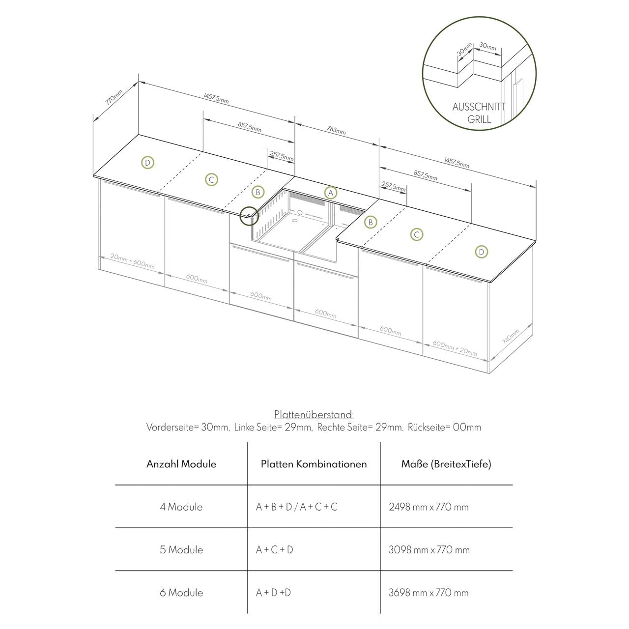 | Lieferumfang | » 2x elements Stirnblenden » 2x Modul mit 1/3 Schublade und 2/3 Tür » 1x Grillmodul mit 2x 2/3 Schranktüren » 1x HPL-Arbeitsplatte (3 Plattenzuschnitte15 mm) » je nach Variante mit/ohne vivandio fyre X Einbaugrill » Lieferung als Flatpack, ohne Dekoration und Zubehör |
