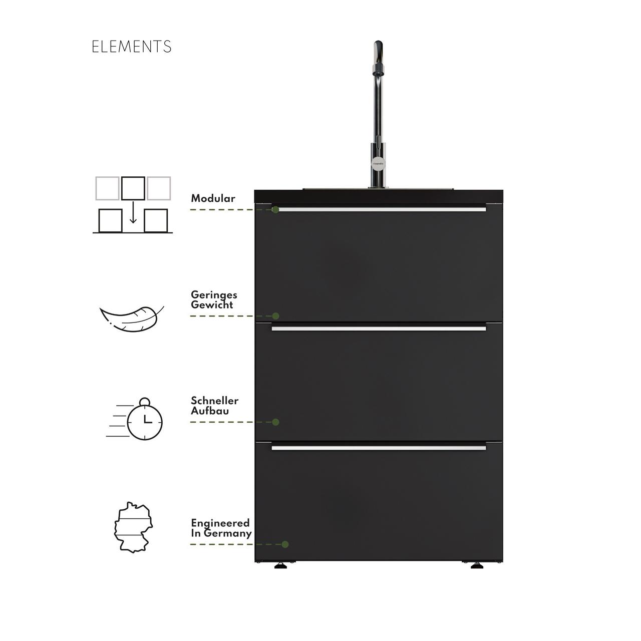 | Lieferumfang Küche | » 2x elements Stirnblenden » 1x Modul mit 3 Schubladen » 1x Modul mit 1/3 Schublade und 2/3 Tür » 1x Brückenblende für Unterbaugerät » 1x FS-150 Outdoor-Kühlschrank » 1x Grillmodul mit 2x 2/3 Schranktüren » 1x HPL-Arbeitsplatte (3 Plattenzuschnitte, 15 mm) » je nach Variante mit/ohne vivandio fyre X Einbaugrill » Lieferung als Flatpack, ohne Dekoration und Zubehör |