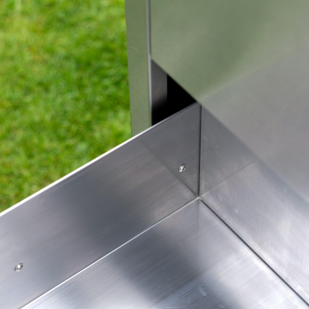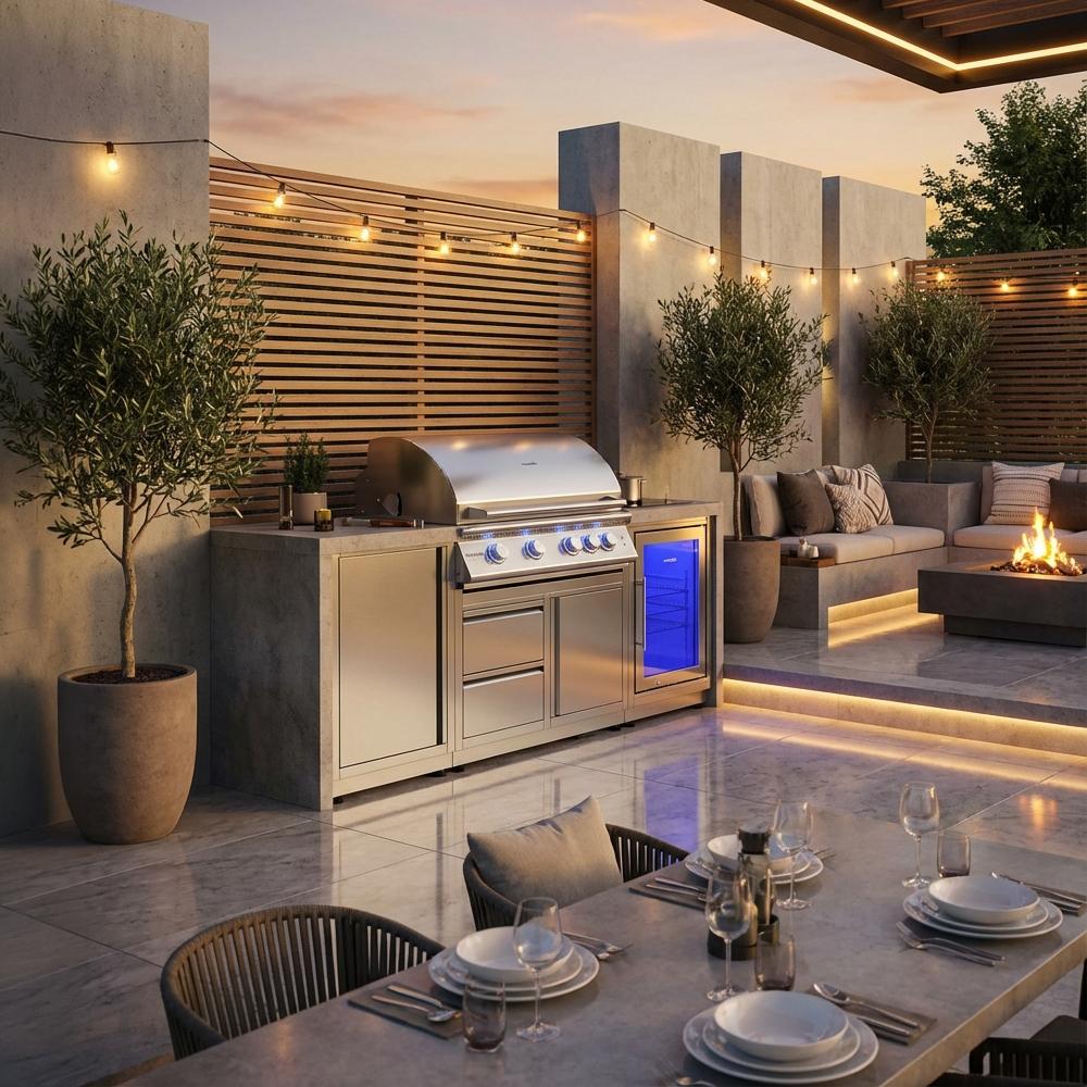 Alle Einheiten teilen dieselbe Materialsprache, schließen bündig aneinander an und bilden eine kompakte, vollwertige Outdoorküche.