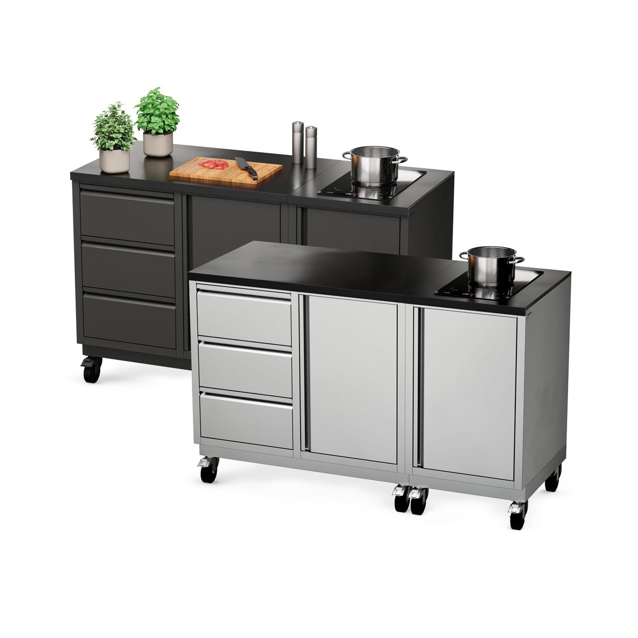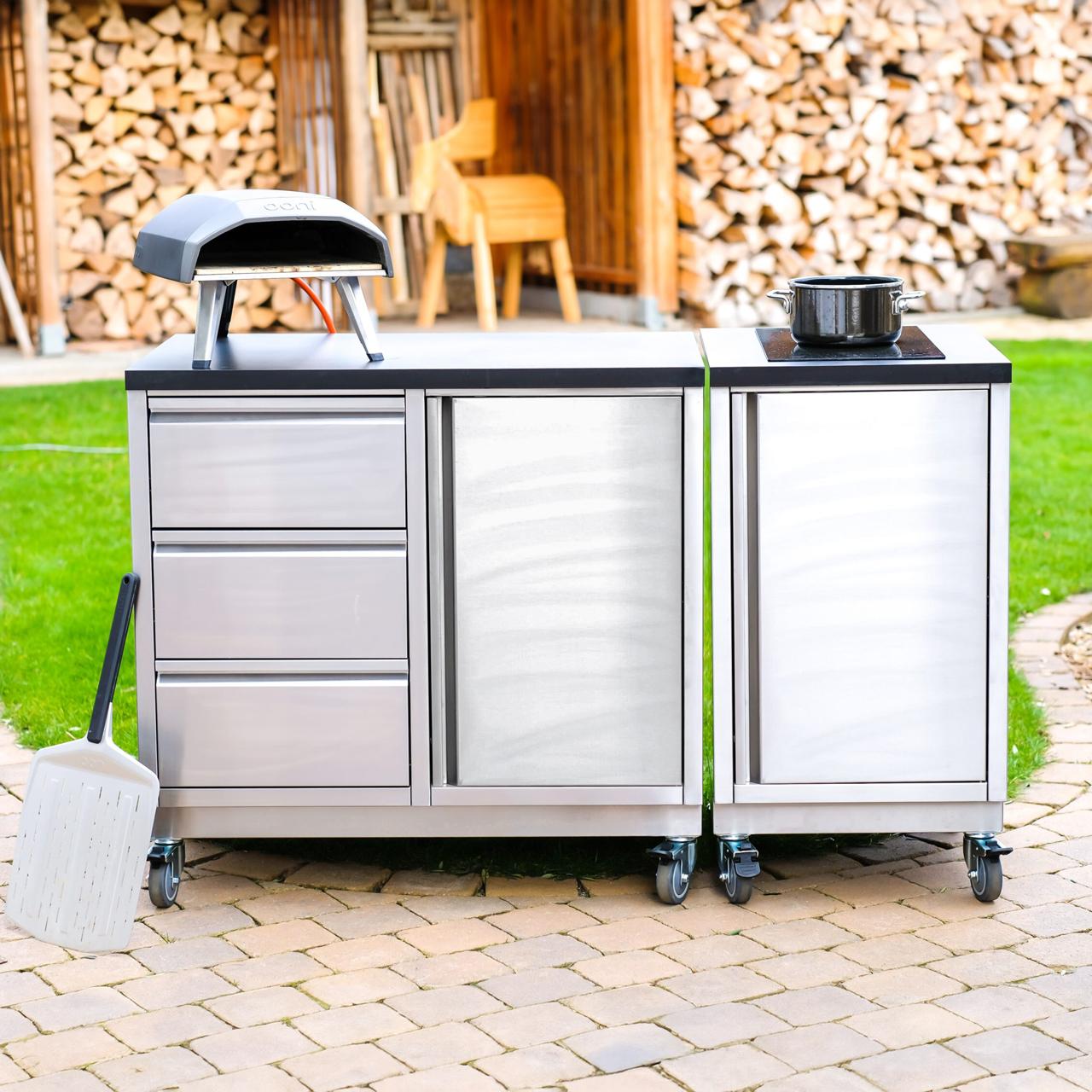 Dank der hochwertigen Rollen lässt sich die Kochstation flexibel bewegen und je nach Bedarf in eine geschützte oder sonnige Position bringen. So können Sie Ihre Outdoor-Küche dort einsetzen, wo Sie sie gerade benötigen – für maximalen Komfort und Anpassungsfähigkeit.