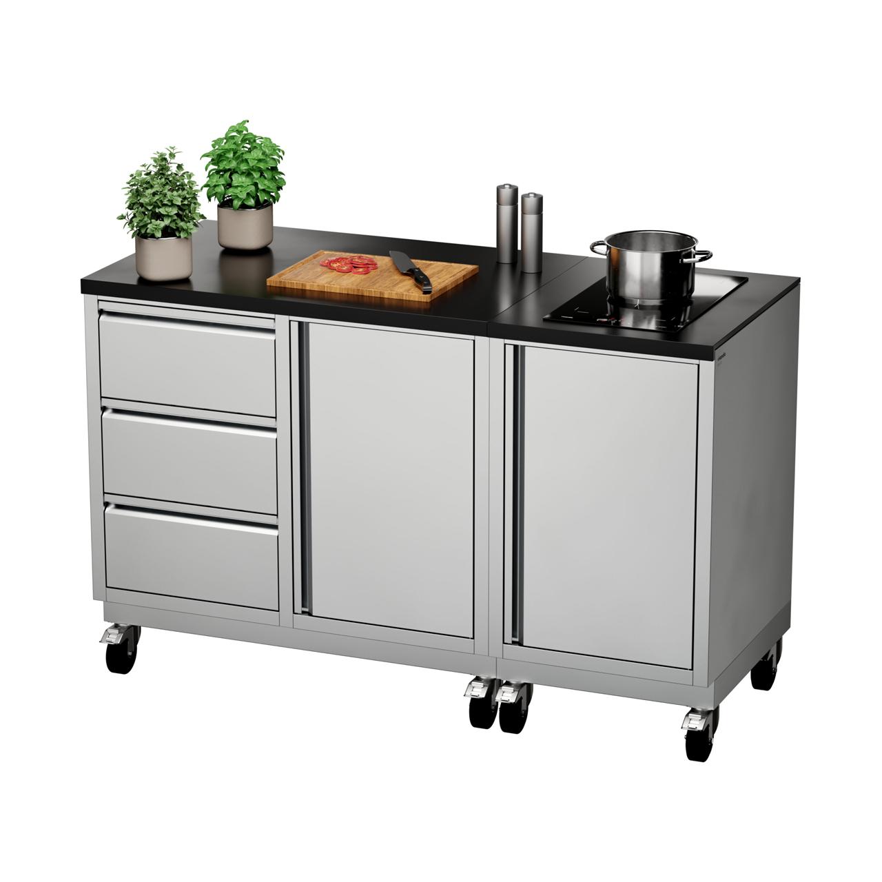 - 1x quub Einzelmodul mit Tür und Kochfeld, mit Rollen und Arbeitsplatte