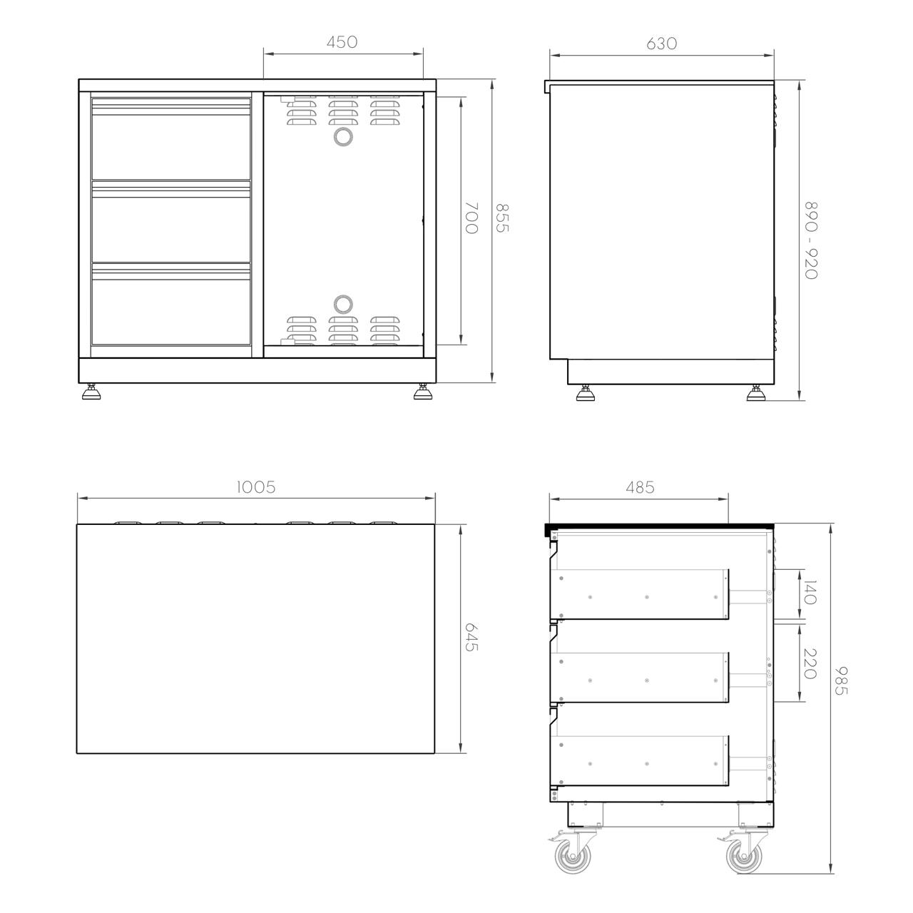 - Stauraum: Softclose-Schubladen mit Vollauszug, wetterfesten Griffen und Drainagen für den Outdoor-Einsatz.