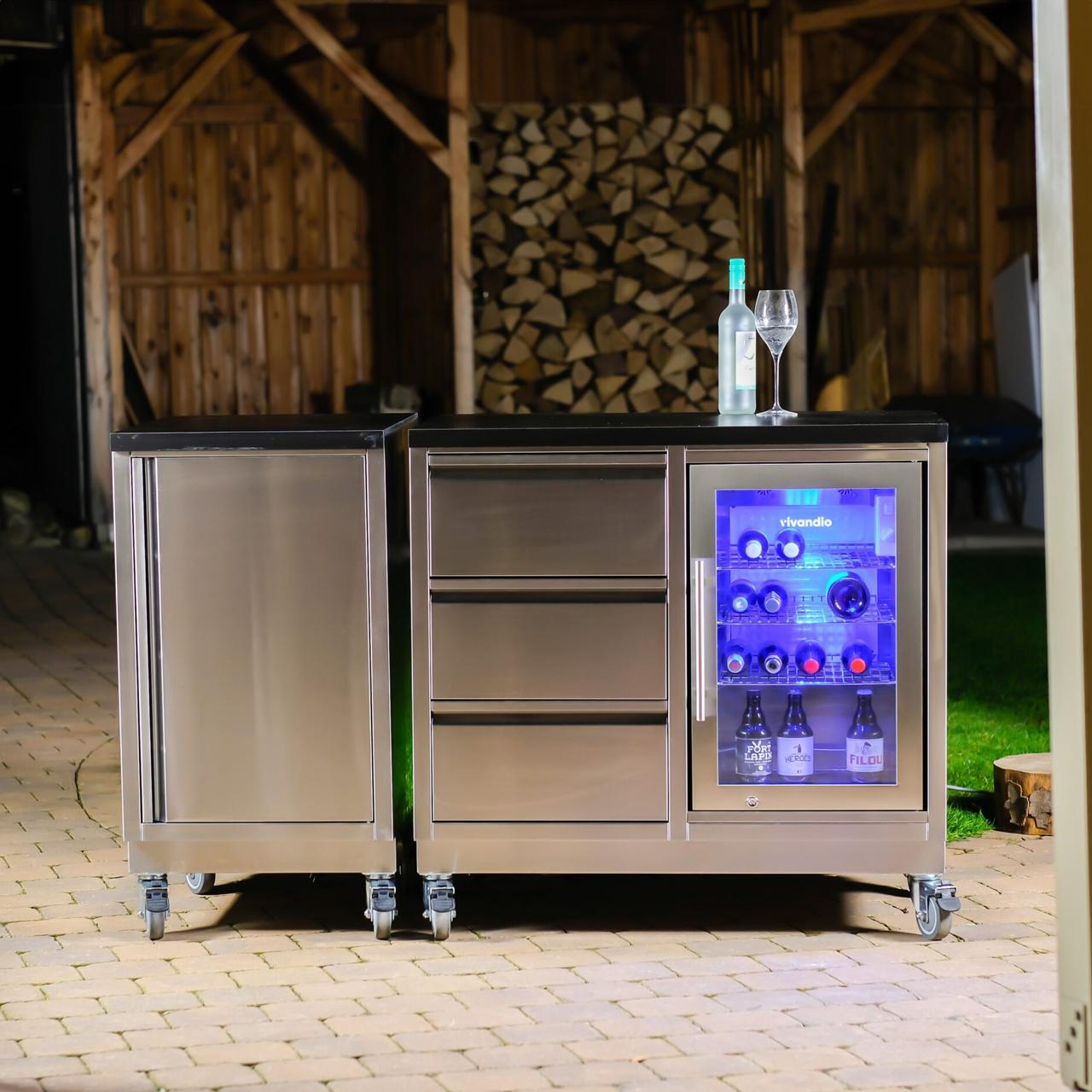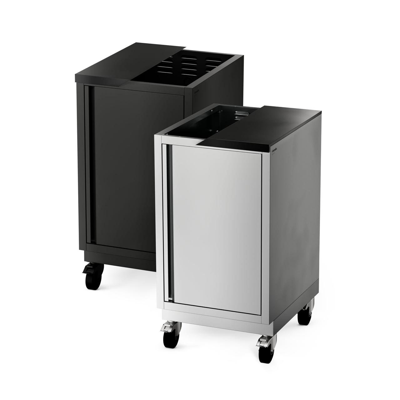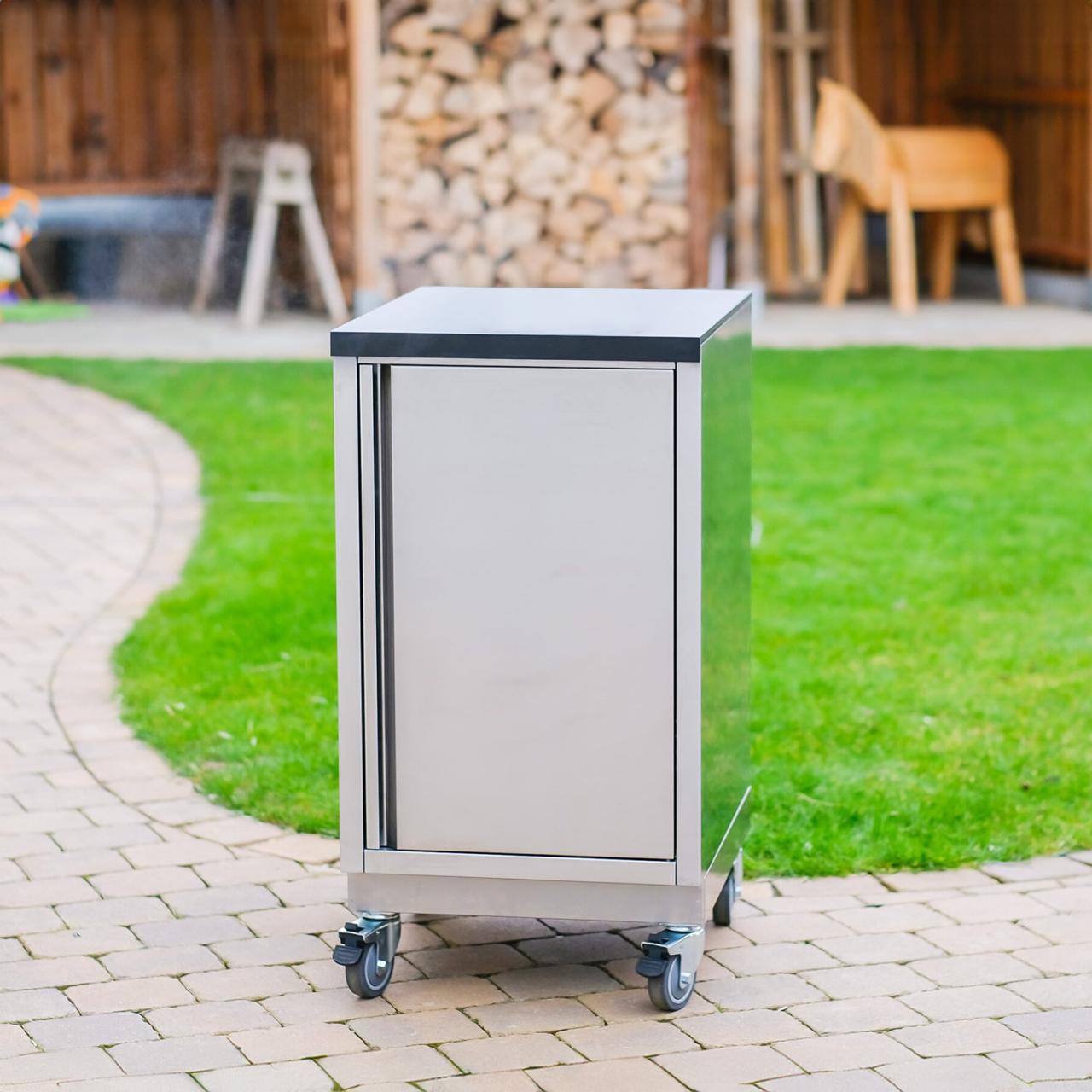 Dank des modularen Aufbaus lässt sich das Modell sowohl als eigenständiges Element nutzen als auch nahtlos in eine größere Outdoor-Küchenzeile integrieren. Auf Wunsch kann er ohne Arbeitsplatte bestellt werden, um individuelle Küchensysteme zu ergänzen. Mit der Möglichkeit, das Modul auf Stellfüßen oder Lenkrollen zu montieren, bleibt maximale Flexibilität gewährleistet – egal, ob stationär oder mobil.