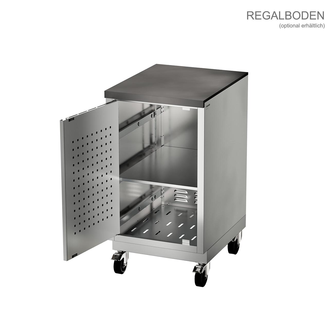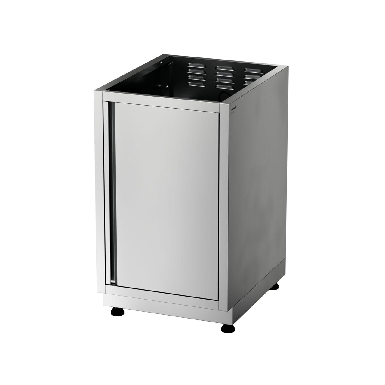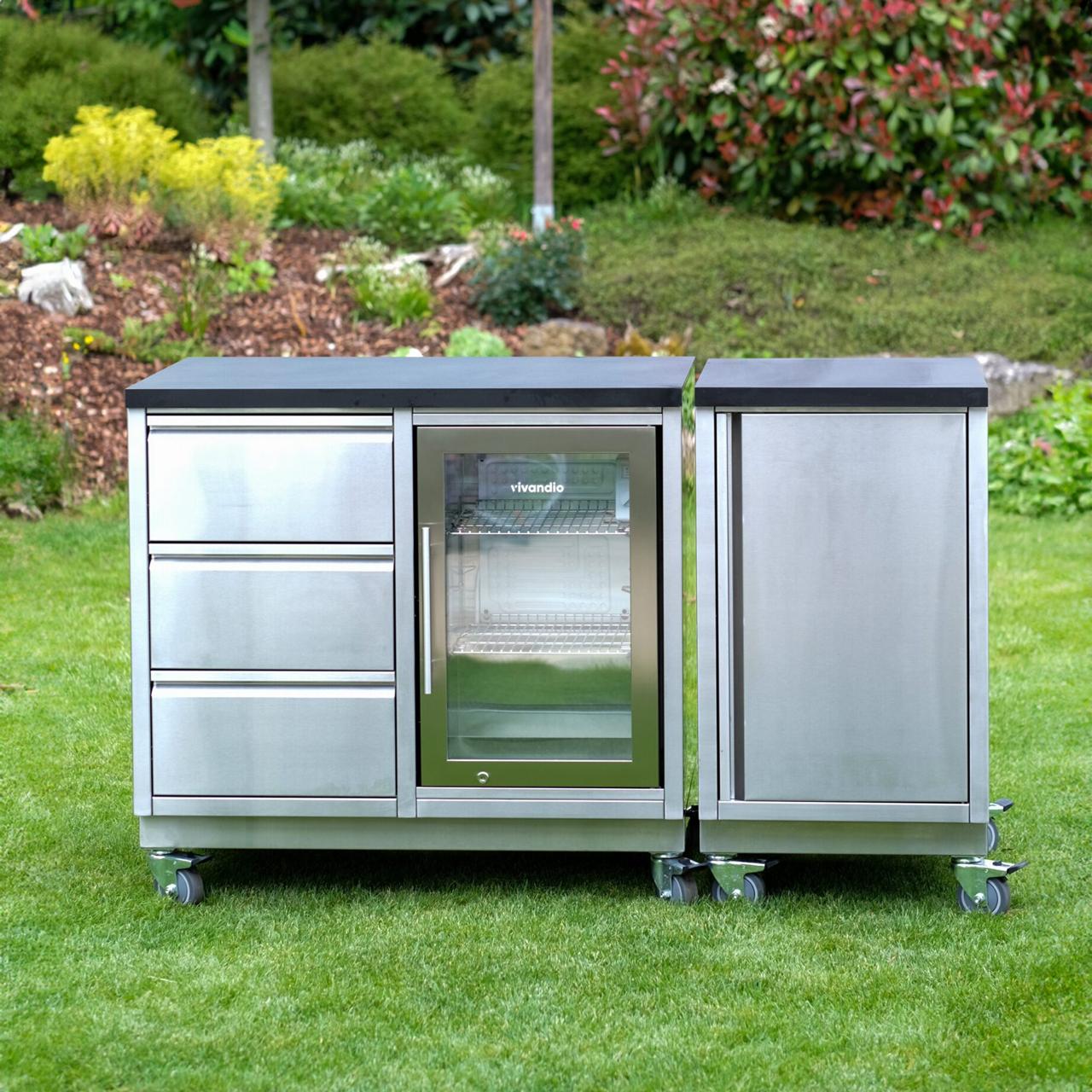 Dank des modularen Aufbaus lässt sich das Modell sowohl als eigenständiges Element nutzen als auch nahtlos in eine größere Outdoor-Küchenzeile integrieren. Auf Wunsch kann er ohne Arbeitsplatte bestellt werden, um individuelle Küchensysteme zu ergänzen. Mit der Möglichkeit, das Modul auf Stellfüßen oder Lenkrollen zu montieren, bleibt maximale Flexibilität gewährleistet – egal, ob stationär oder mobil.