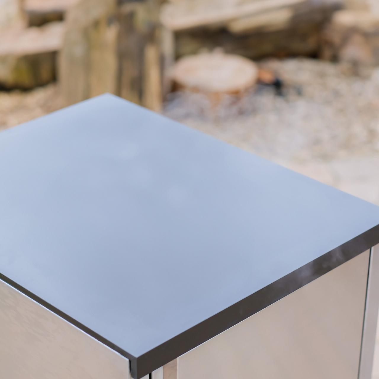 Der Korpus besteht aus hochwertigem Edelstahl in gebürsteter Ausführung oder mit einer witterungsbeständigen Pulverbeschichtung. Damit ist der Schrank nicht nur besonders robust, sondern auch für den ganzjährigen Einsatz im Freien geeignet. Die Arbeitsplatte aus Feinsteinzeug verleiht dem Modul eine edle Optik und bietet eine pflegeleichte, widerstandsfähige Oberfläche.