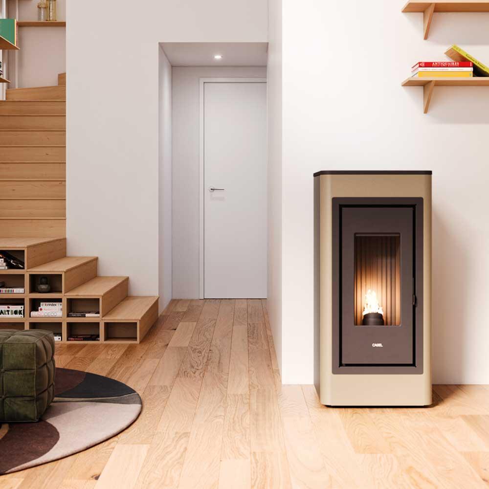 Neuer belüfteter Pelletofen Cadel Kobe 11, mit großer Glasscheibe und eine Topplatte mit innovativem Design. Große Auswahl an Ausführungen, wodurch der Pelletofen jedem Ambiente angepasst werden kann. 5-Sterne-Brennkammer, GoFast-Zündeinrichtung und Flexit-Technologie für eine größere Vielseitigkeit bei der Rauchgasemission.
