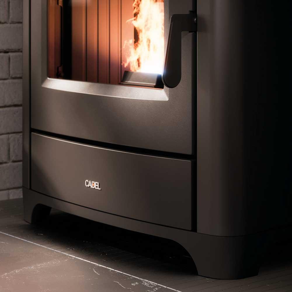 Die große Tür des Cadel ist aus Gusseisen und ermöglicht eine bessere Sicht auf das Feuer. Die Tür, die Topplatte, der Grillrost und der Sockel aus Gusseisen verleihen diesem Pelletofen Ofen eine fast monolithische Präsenz.