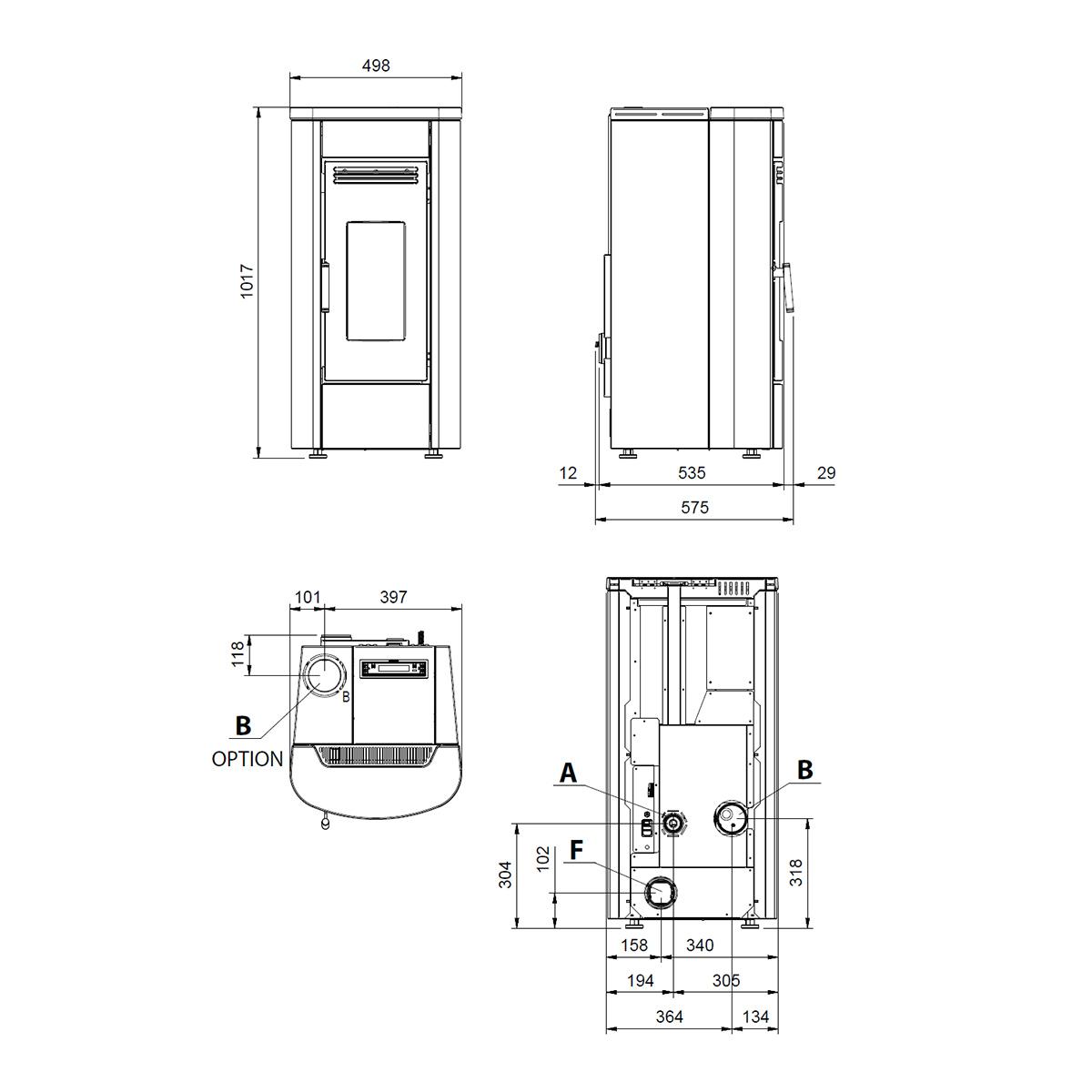 Das Abgasrohr wird nach oben abgeführt, was den Anschluss an bestehende Systeme vereinfacht. Der Ofen wiegt 101 kg und benötigt durch seine kompakte Bauweise von 1017 x 498 x 575 mm (HxBxT) nur wenig Stellfläche. Dadurch eignet er sich optimal für kleinere Wohnbereiche. Der 80 mm Rauchrohranschluss ist nach oben oder hinten möglich.