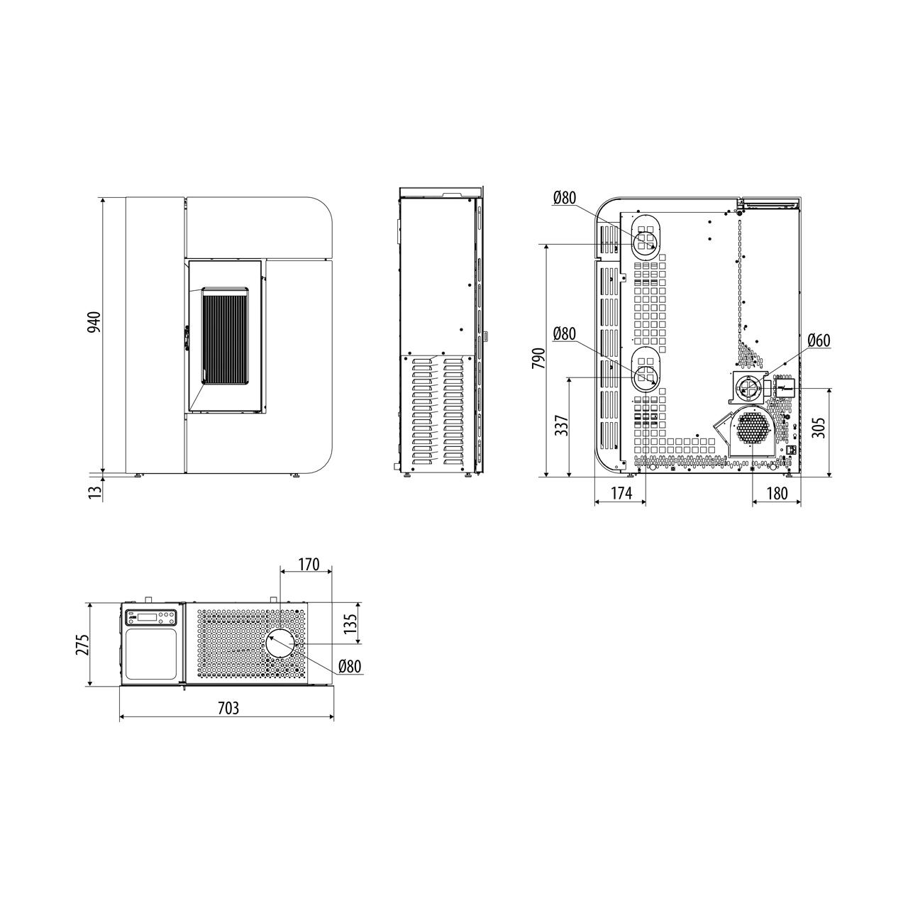 - Für die Installation nach hinten notwendig: Pelletrohrbogen 90°, lackiert mit Silikondichtung Ø 80 mm