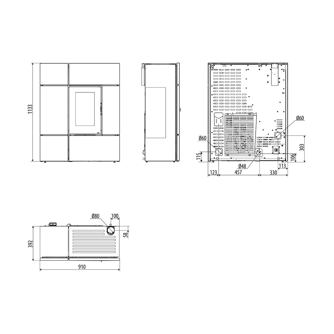 Anschluss obenDer Pelletofen verfügt über einen Rauchauslass nach oben. Er kann somit an bereits bestehenden Rauchabzüge angeschlossen werden, wodurch der Wohnraum optimiert wird und die Installationskosten verringert werden.
