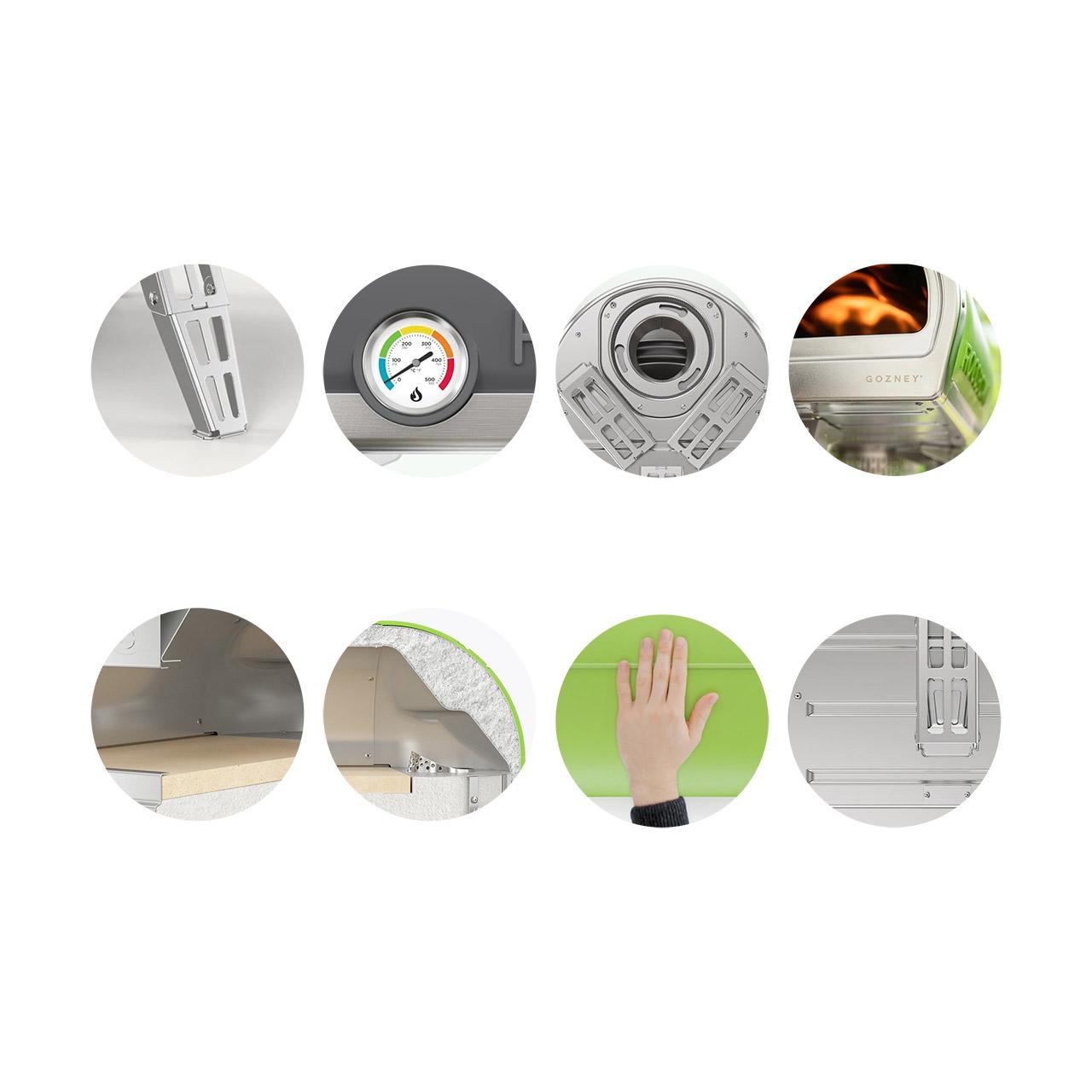 - eingebautes Thermometer auf Höhe des Steinbodens, Sie müssen nie raten, wann Ihr Essen fertig ist
