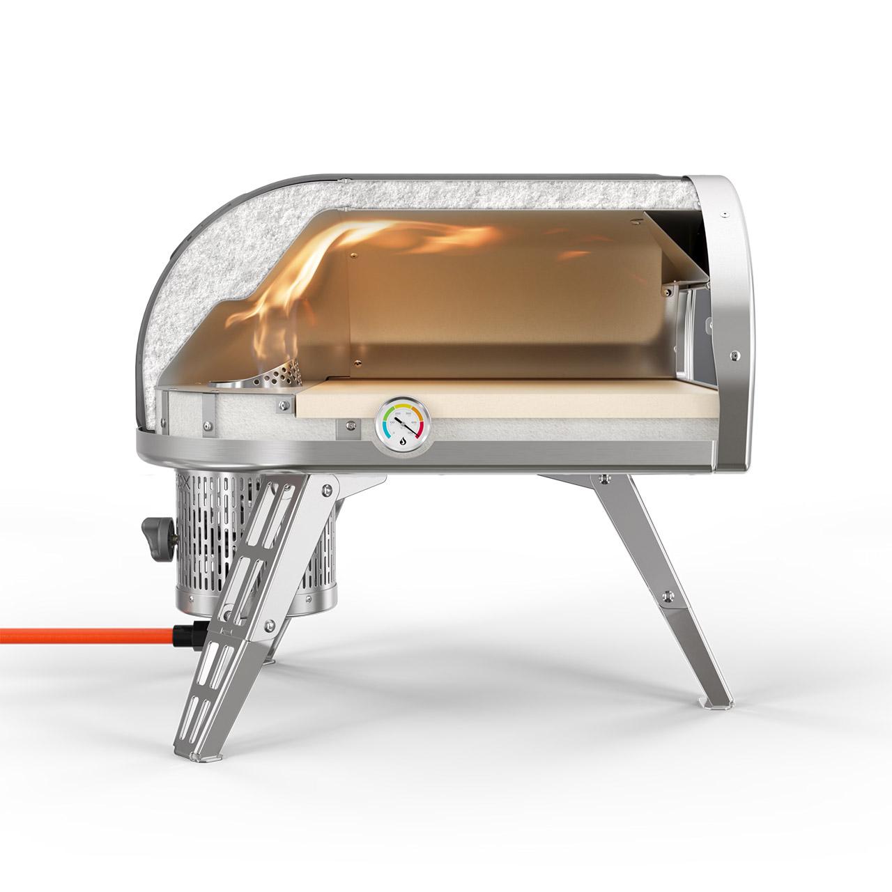 Im Backraum erreicht der tragbare Ofen bis zu 500° C und erleidet durch seine patentierte Prallplattentechnologie, trotz der 300x88 mm großen Ofenöffnung, kaum Wärmeverluste. Hinzu kommt, dass der einzigartige Gozney-Brenner eine rollende Flamme erzeugt. Auf diese Weise wird der Brennraum von oben nach unten erwärmt und dennoch ein perfekter Abstand von der Flamme zur Pizza gewährleistet. Um keine Verwirrung zu stiften hat Gozney ein eingebautes Thermometer direkt auf Höhe des Steinbodens platziert. Damit wird an richtiger Stelle angezeigt wann der Ofen auf Betriebstemperatur ist und Sie können Ihre DIY-Pizza innerhalb von nur 60 Sekunden Backzeit genießen.Kleiner Ofen - große Taten