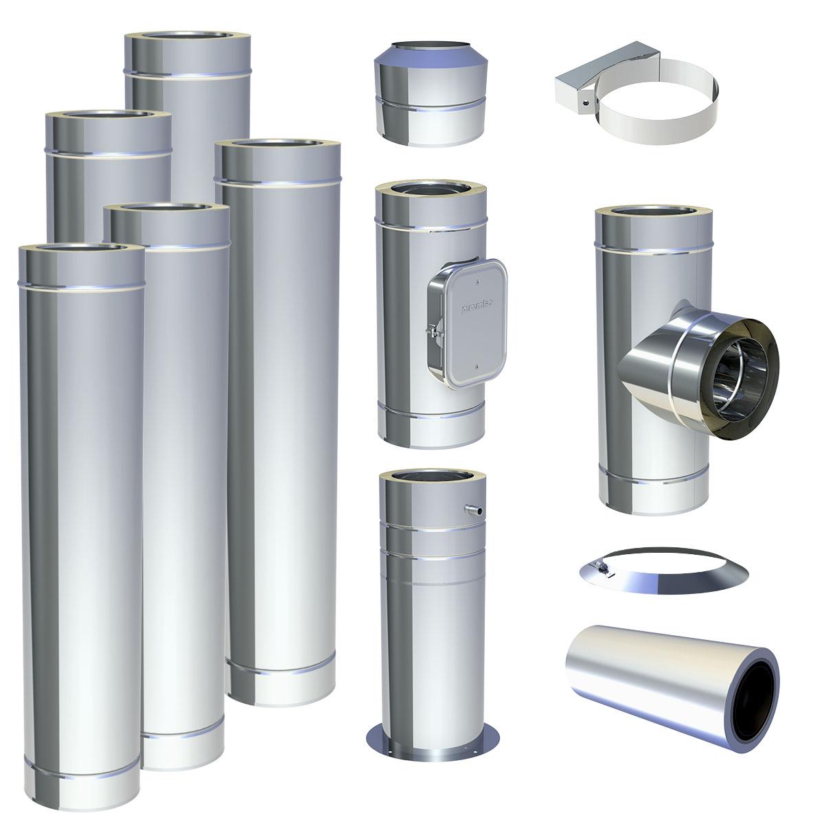 8 m Edelstahlschornstein Bausatz doppelwandig Jeremias DW-FU Ø 250 mm - Montage: Boden - Wandabstand: 50 mm - Oberfläche: Edelstahl hochglanz