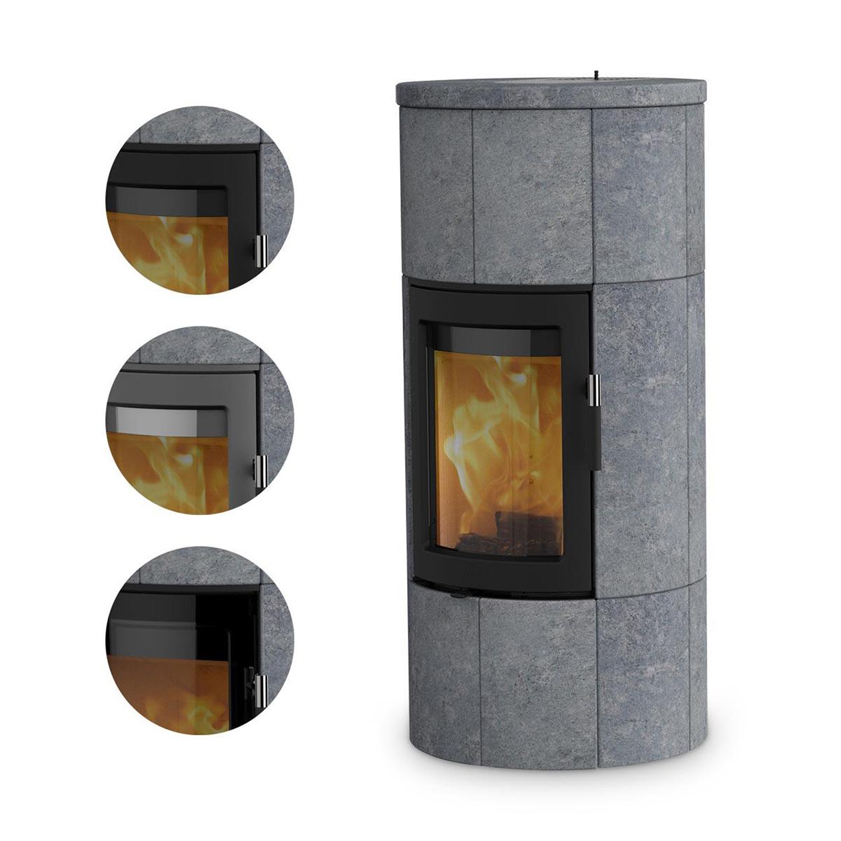 Speicherofen geschaffen, den Sie frei nach Ihren Wünschen im Raum aufstellen können. Der Ofen besticht durch ein auffälliges Naturstein-Design, welches nur durch die großzügige Sichtverglasung unterbrochen wird. Über die gebogene Feuerraumtür des