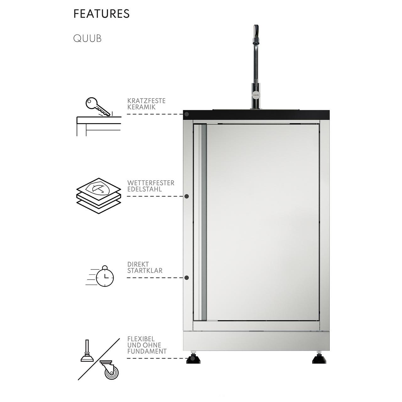 Die quub-Module bestehen aus hochwertigem Edelstahl und sind wahlweise in gebürstetem Edelstahl oder mit einer wetterbeständigen schwarzen Pulverbeschichtung erhältlich. Alle verwendeten Komponenten, wie Vollauszüge und Schrauben, sind selbstverständlich ebenfalls in witterungsbeständiger Ausführung gewählt.