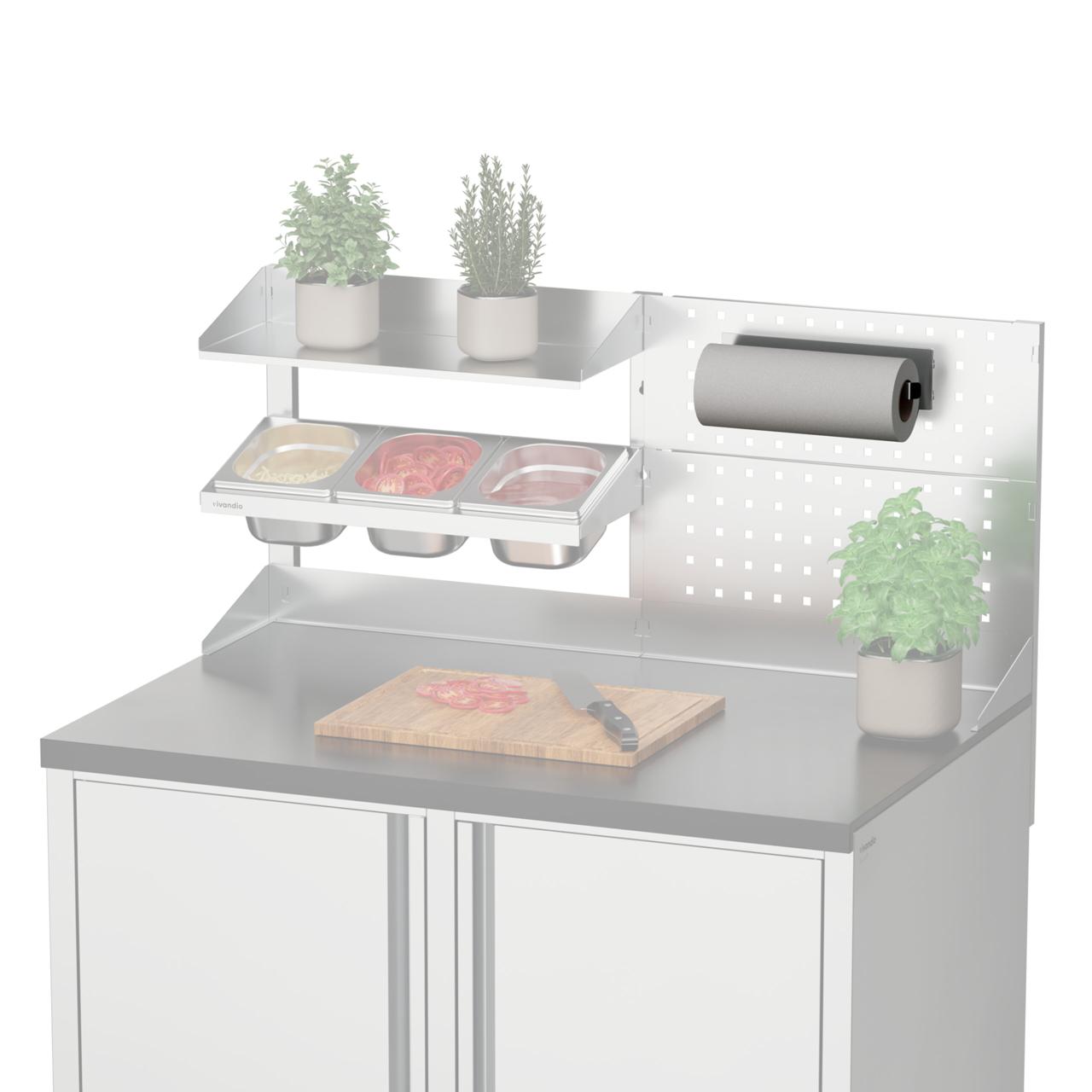 Das quub Rückwandsystem ist eine intelligente Erweiterung Ihrer Outdoorküche, mit der Sie Ihre Arbeitsfläche noch praktischer gestalten können. Der Basisanbau besteht aus drei Trägern und kann in zwei Höhen montiert werden – wahlweise als zweistöckige Rückwand oder als Umrandung der Arbeitsplatte. Während beim Einzelmodul nur zwei Träger benötigt werden, nutzt das Doppelmodul alle drei Träger für eine größere Arbeitsfläche. Dank verschiedener Einsätze können Sie das Rückwandsystem individuell anpassen. Der Regaleinsatz schafft zusätzlichen Stauraum, während der Gastronorm-Einsatz perfekt für standardisierte Behälter geeignet ist (wahlweise für 3x 1/6GN oder 1x 1/6GN + 3x 1/9GN). Die Lochblechhalterung ermöglicht eine flexible Nutzung mit Haken- oder Magnethaltersystemen, sodass Sie Ihre Küchenutensilien stets griffbereit haben. Ein Küchenrollenhalter, der sich in das Lochblechmuster der Rückwand einfügt, sorgt für zusätzlichen Komfort, während der Spritzschutz Ihre Arbeitsfläche sauber hält – ideal für die Zubereitung von Pizzateig. Gefertigt aus hochwertigem, gebürstetem Edelstahl, ist das Rückwandsystem besonders robust, langlebig und wetterbeständig, sodass es optimal für den Einsatz im Freien geeignet ist.